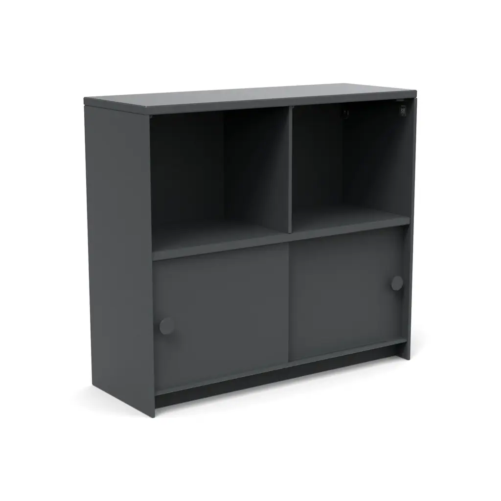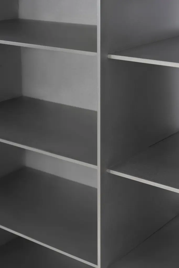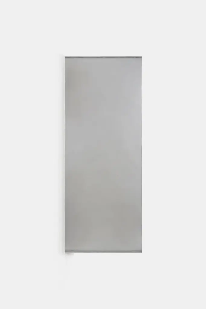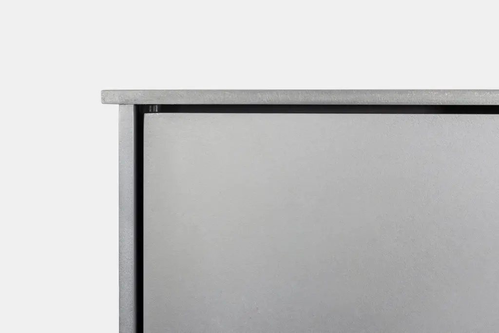 The SC wall-mounted cabinet by Jonathan Nesci is produced in cut and machined aluminum with a waxed finish. The quarter-inch thick doors are set back a quarter-inch and pivot on a spring-loaded stainless pin set on the edge. The doors open with push-to-open Blum hardware. Custom variations available upon request.