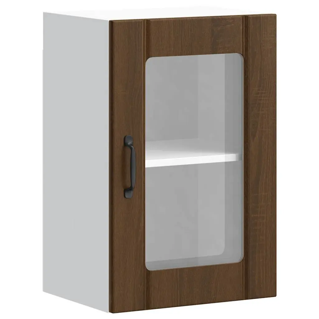 SEKTION Corner wall cab w shelves/glass dr - white Enköping/brown walnut effect 26x15x30 ". The door can be mounted to open to the left or right. You can customize spacing as needed, because the shelves are adjustable. Sturdy frame construction, ¾" thick. Suspension rail sold separately.