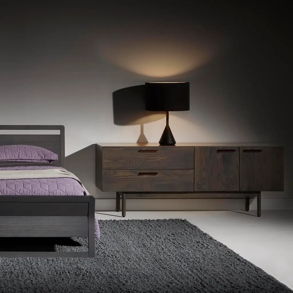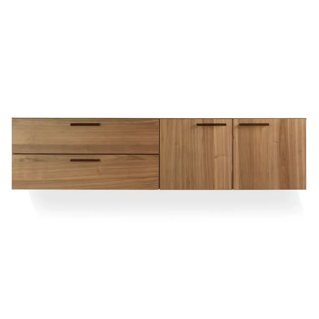 Beautility. Layers of clean details. Solid wood and full grain leather pulls add storage panache and practicality to the bedroom, living room or dining room. Cabinet mounts to the wall, so you can pick the height that is right for your space. Door units feature adjustable shelves and wire management holes. Features