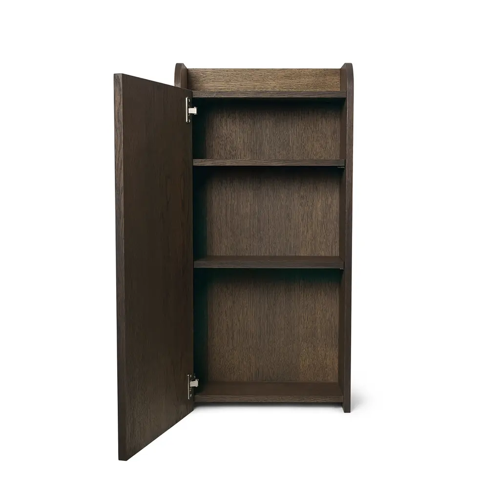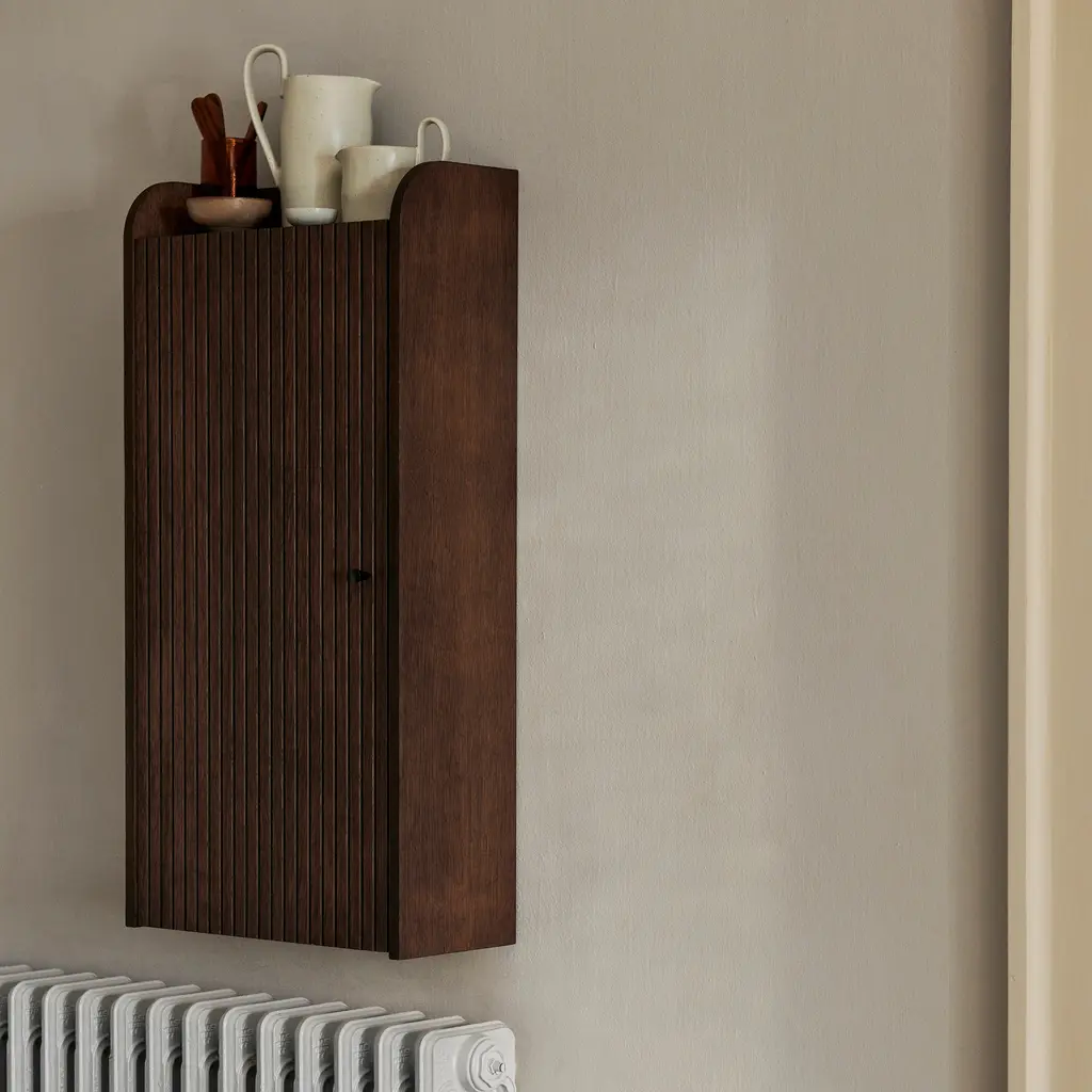 Inspired by the French word for ‘carved grooves’, the Ferm Living Sill Wall Cabinet features a vertical ridge pattern that reminds of timber slat facades. As a result, this cabinet adds a decorative accent to any wall while providing a practical solution to organize items and de-clutter your home. To make this design, Ferm Living uses FSC-certified oak veneer with a dark-stained finish and an MDF core. The door features carved grooves that add an eye-catching pattern to the simple design, and a subtle, small round handle. Inside, there are two shelves, while above, there’s an open shelf that offers room for items you want to keep on display, like plants or artworks. Versatile and perfect for any home décor, the Ferm Living Sill Wall Cabinet suits any area, from kitchens to living rooms and entrance hallways.