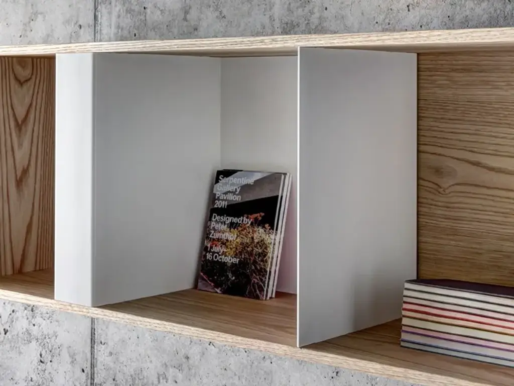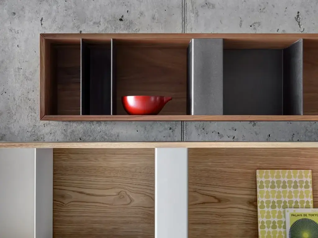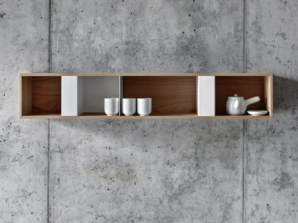 T Box is a hanging cabinets system which create a strong graphic impact due to its rhythmic proportion of full and empty and thinness of materials. Containers are made of solid walnut or chestnut 13 mm thick; inside, functional and decorative dividers are made of steel sheet. Available in different sizes, horizontally or vertically, they can take various functions: from bookcase to storage shelves both for the living and kitchen areas or practical shelves for the bathroom. Finishes: Containers of solid walnut or chestnut wood Dividers in lacquered steel sheer, matt white, iron gray, light blue