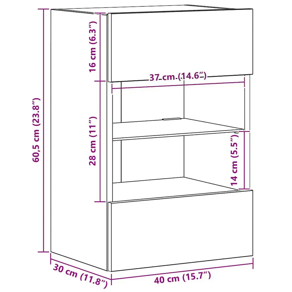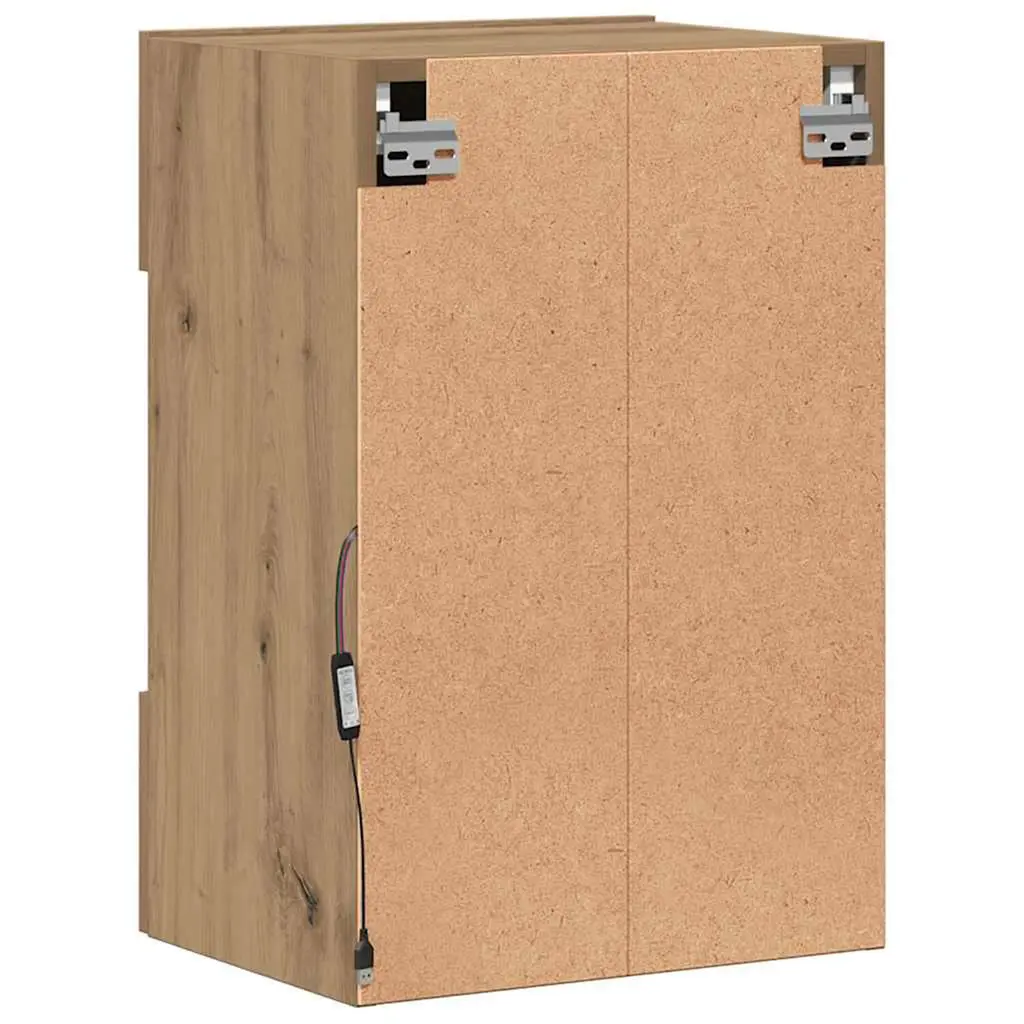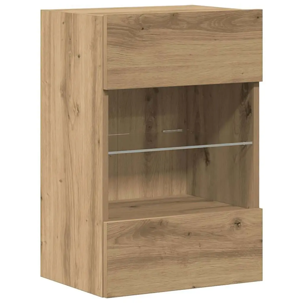 This TV wall cabinet set perfectly mixes looks and function, made for modern homes. The artisan oak finish creates a warm yet stylish vibe, great for showcasing your TV and media gear while adding a touch of class. The built-in LED lighting breathes life into the shelves, allowing for tailored lighting that boosts your entertainment experience. LED Lighting: The built-in RGB LED lighting gives the cabinet a modern edge, allowing you to change colors and set the mood for any occasion.Spacious Storage: With two cabinets, this unit has loads of room for all your audio-visual gear, keeping your living space clutter-free.Modern Aesthetic: The sleek lines and smooth finish make it a perfect addition to any decor, whether minimalist or transitional.Easy Wall Mounting: This cabinet is designed to be wall-mounted, freeing up floor space while maintaining a neat look in your room.Durable Materials: Made from engineered wood and synthetic glass, this cabinet is stylish but built to last, so you'll enjoy its benefits for years to come.