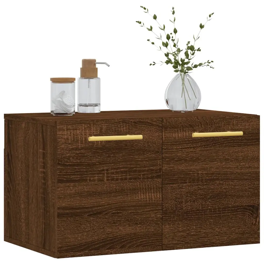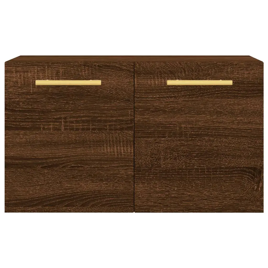 This wall cabinet is a classy addition to any home, especially in a living room or office where it blends function with style. Its lovely brown oak finish adds a warm touch to any decor, beautifully showcasing your favorite items. Spacious Storage: The cabinet offers loads of room with its two doors and top surface, perfect for keeping or showing off anything from books to decor.Stylish Design: The modern touches feature clean lines and a smooth finish, making it a great fit for contemporary interiors.Durable Material: Built from high-quality engineered wood, this cabinet can handle regular use and still look good.Versatile Use: It's great for a variety of spaces, working well in living rooms, bedrooms, or offices for better organization.Easy Installation: Wall-mounted to save on floor space, the cabinet is designed for quick and easy setup with minimal tools needed.