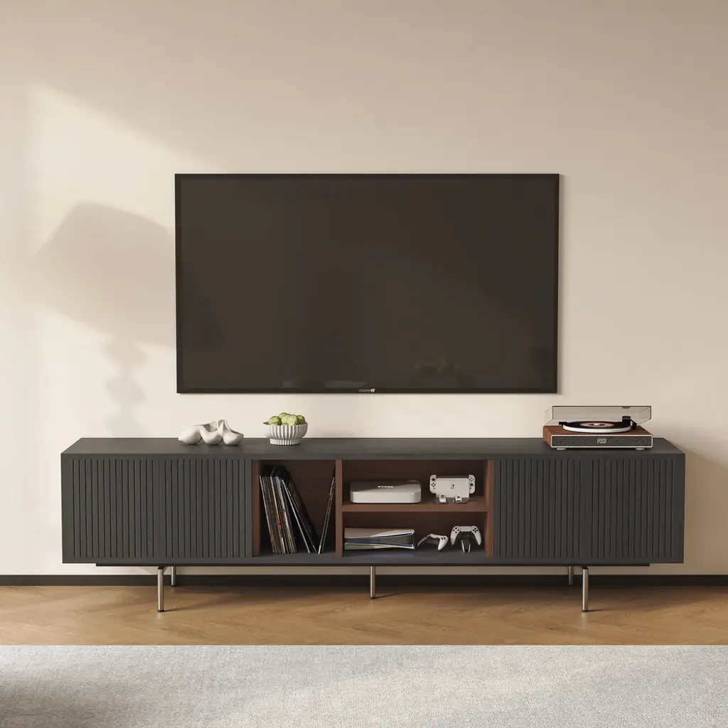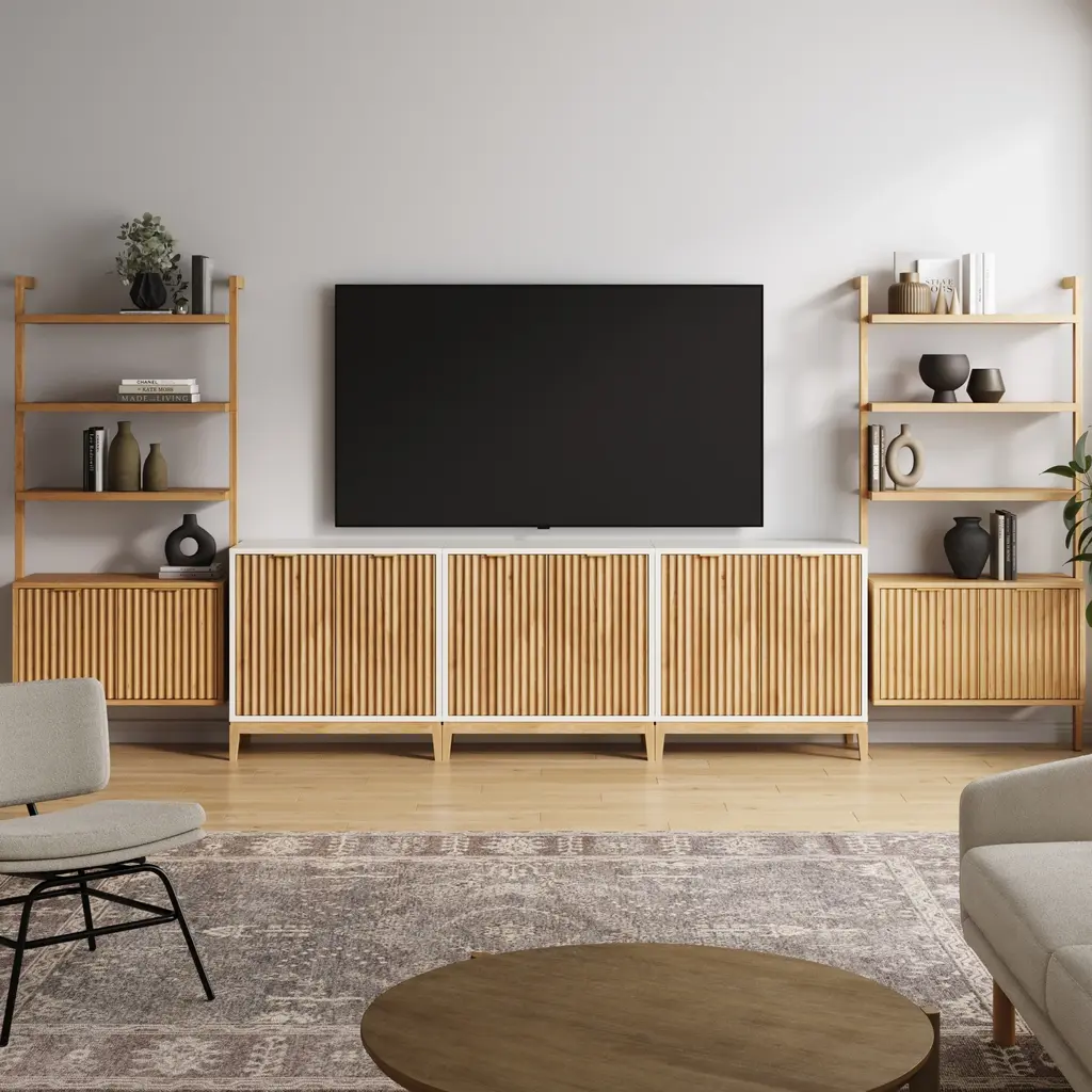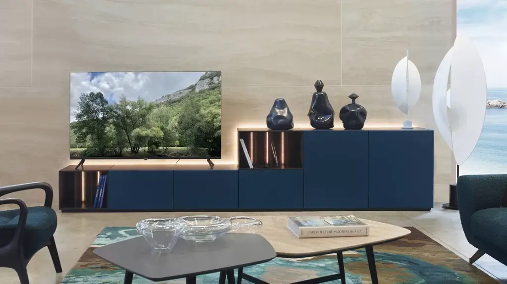 Composed of: 1 'bookcase' W.45 (3 compartments) with back and lighting + 1 'bookcase' W.45 (4 compartments) with back and lighting + 3 drop-down units W.60 x H.34.6 with top + 2 units with hinged doors W.60 x H.70 cm with top + finished sides + backlighting, all on a H.3 cm base. Made in Europe The term 'bookcase' is used for compartments with dividers.