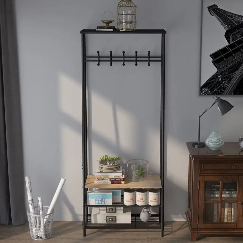 This multipurpose hall tree is not just limited to the entryway but also suitable for various spaces throughout your home—from the kitchen to the living room, corner areas, and even bedrooms. Its rustic charm effortlessly enhances any home decor, making it a stylish addition to any room. Available in different sizes to accommodate your specific needs, this coat rack provides the flexibility to fit seamlessly into your space.Feature: 1.This stylish hall tree features a top shelf perfect for storing handbags, clothes, towels, and more, allowing you to keep frequently used items conveniently.2.This multifunctional hallway organizer is equipped with 5 robust C-shaped hooks, offering convenient temporary storage for your items.3.This 4-in-1 wood look accent furniture features a dedicated shoe rack designed to keep multiple pairs of shoes neatly stored and organized.4.This coat rack shoe bench provides a convenient place to sit while putting on or taking off your shoes. Specification:Material: MDF/ SteelProduct Size: 25.2''D x 11.4''W x 70''H The Top Particleboard Panel Size: 23.6''D x 20.5''WThe Lower Particleboard Panel Size: 23.6''D x 29''W Distance Between Each Shelf(From Bottom to Top): 6.7''/6.7''/35.4''/9.6''Max. Static Load Capacity of Each Hook: 6 lb Max. Static Load Capacity of bench: 200 lb Max. Static Load Capacity each Shelf: 15 lb Packing list: 1 coat rack shoe bench(including instruction manual and accessories) Note:Carefully follow the installation instructions when assembling. Before beginning the installation process, ensure that you have all the parts and tools you need.Before making a purchase, consider factors like height, width, and depth to ensure the size of the item you are considering fits your need.