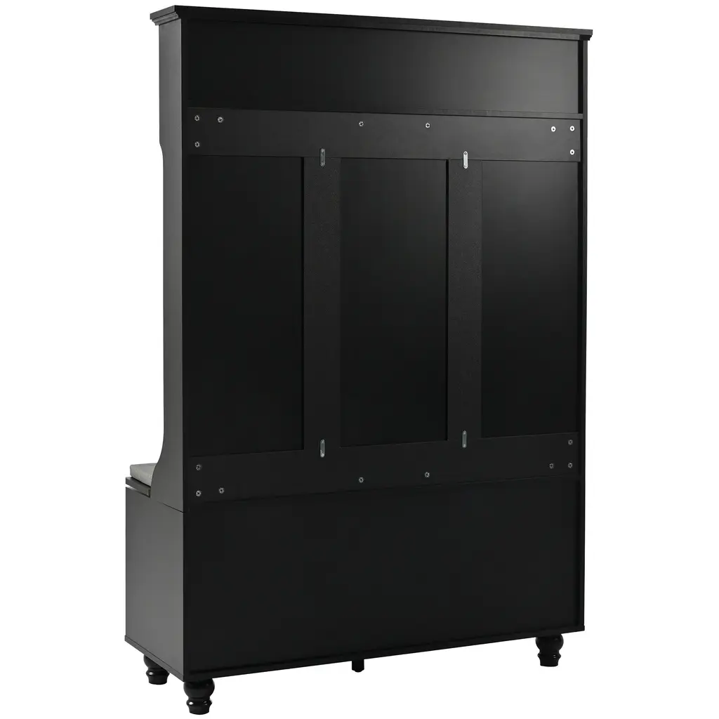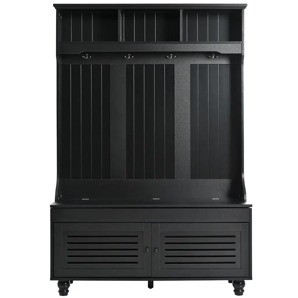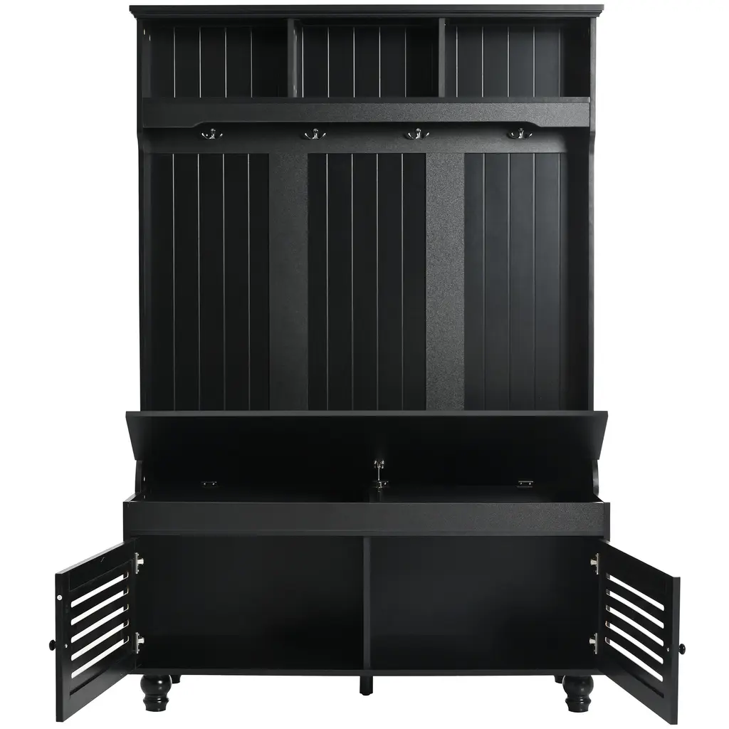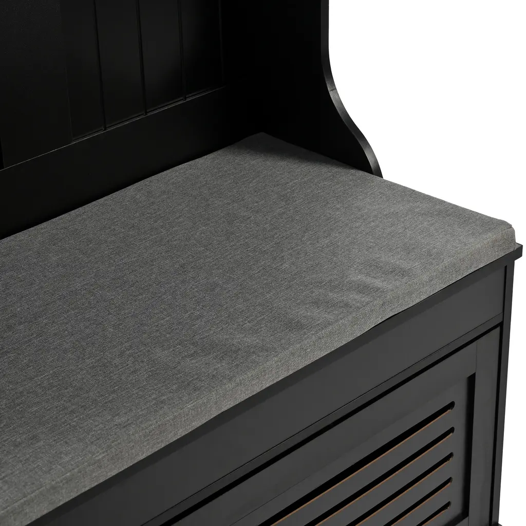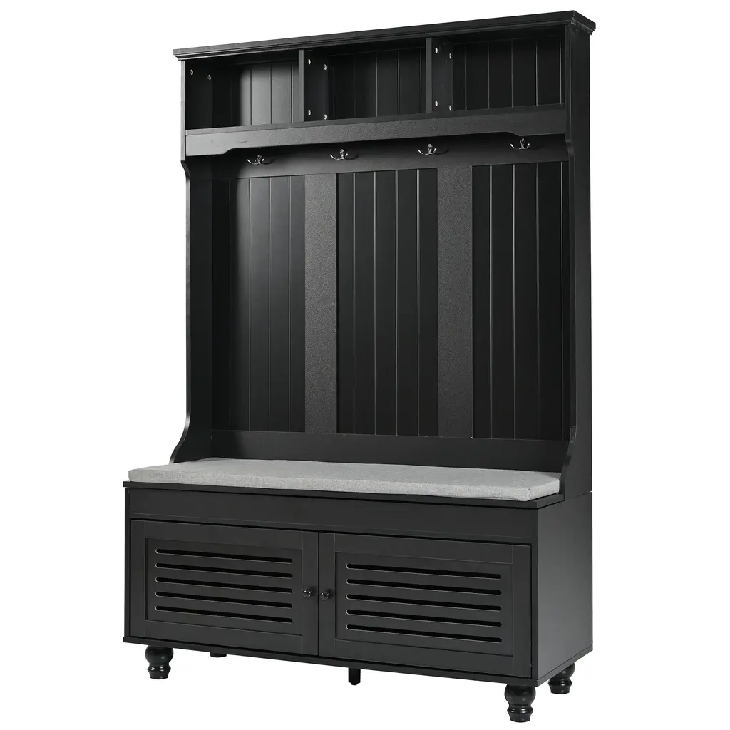5 In 1 Entryway Bench With Shutter Shaped Doors,coat Rack,cushion And 4 Sturdy Hooks - Black