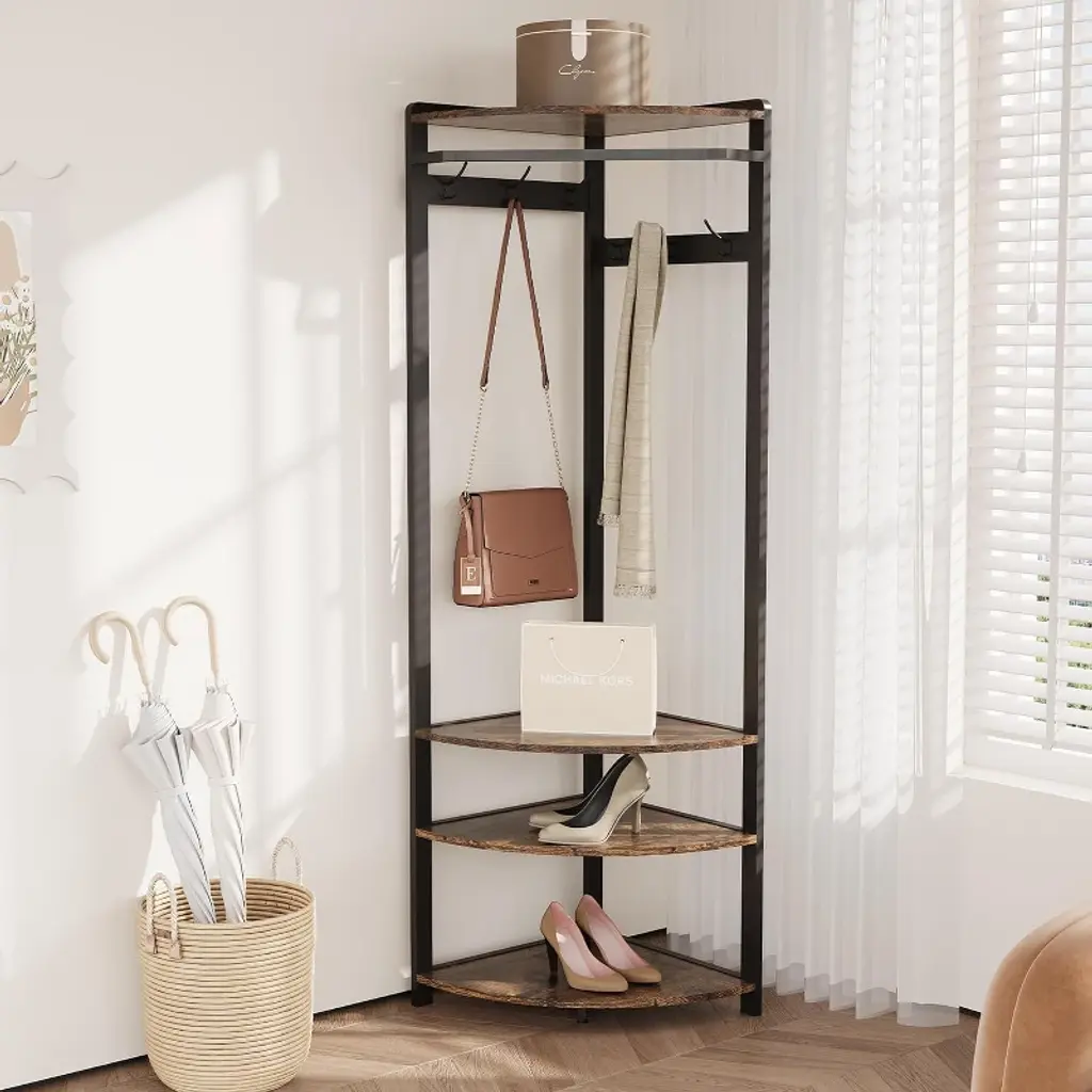 This 3-in-1 narrow corner coat rack combines a coat rack, shoe rack, and top storage shelf in one sleek design. Featuring a clothes hanging rod with 6 double hooks, it offers ample space for your daily essentials, helping keep your entryway neat and organized. Perfect for your entryway, bedroom, or living room, it’s a versatile home organizer that maximizes your space. Designed to make the most of limited corner spaces, this 70.8-inch tall corner hall tree accommodates clothing of various lengths. It’s an ideal addition to your entryway, living room, bedroom, or dressing area, providing functional and stylish storage where you need it most. For added safety and stability, this corner coat rack features four secure corner supports at the base and two anti-tilt brackets at the top. This ensures the rack stays steady and secure, giving you peace of mind every time you use it. The top hooks are perfect for hanging umbrellas, coats, hats, and more. This multifunctional corner rack fits seamlessly into most home corners, while the entryway bench offers convenient seating and shoe storage. It’s a practical, elegant solution that helps keep your home tidy and organized. The corner coat rack is designed for fast installation. Simply twist the parts together by hand following the clear instructions and numbered components.