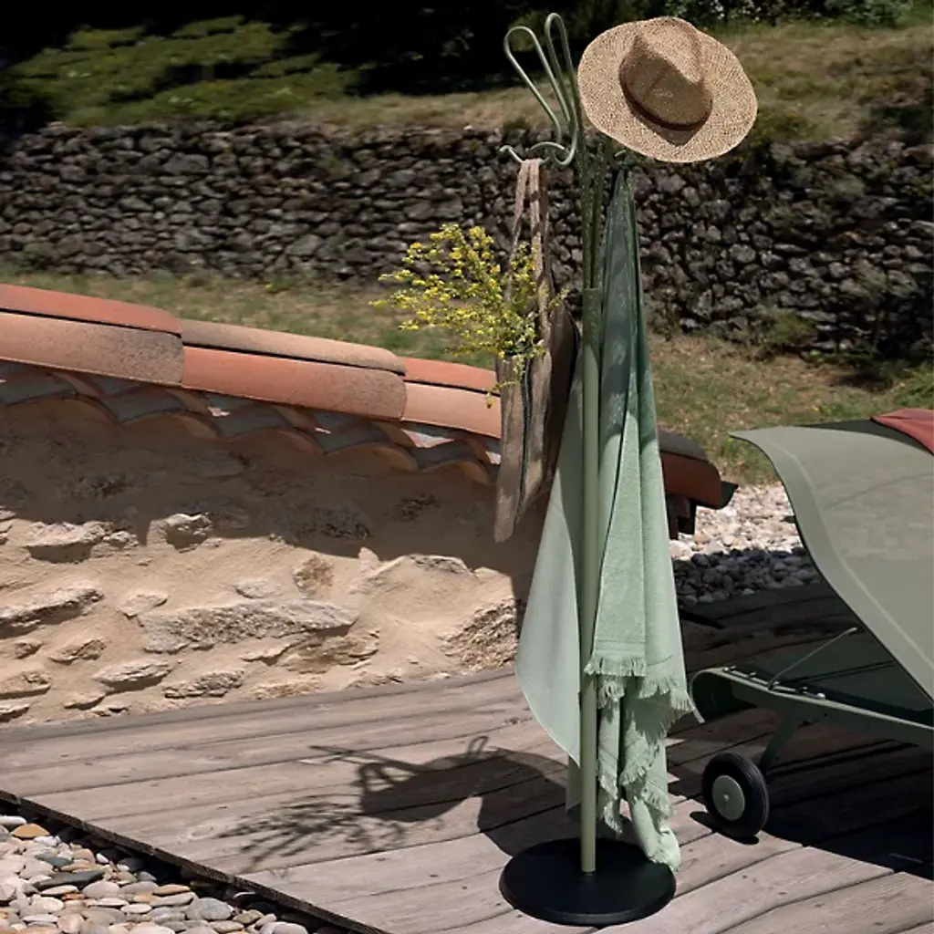 Neo-romantic design made for you to love. The Accroche Coeurs Coat Stand by Fermob is a reissue of the classic 1993 design by Pascal Mourgue, which was then created as an elegant, all-metal take on the bent wood “perroquet” coat stand. Starting with a heavy cast iron base, a tubular aluminum stem culminates in 4 steel wire curves. Each curve offers 2 points to hang coats, hats, towels and more: at the top of the main curve and at its end. Finished off with a durable polyester powder coat, this stand can be used indoors or out.