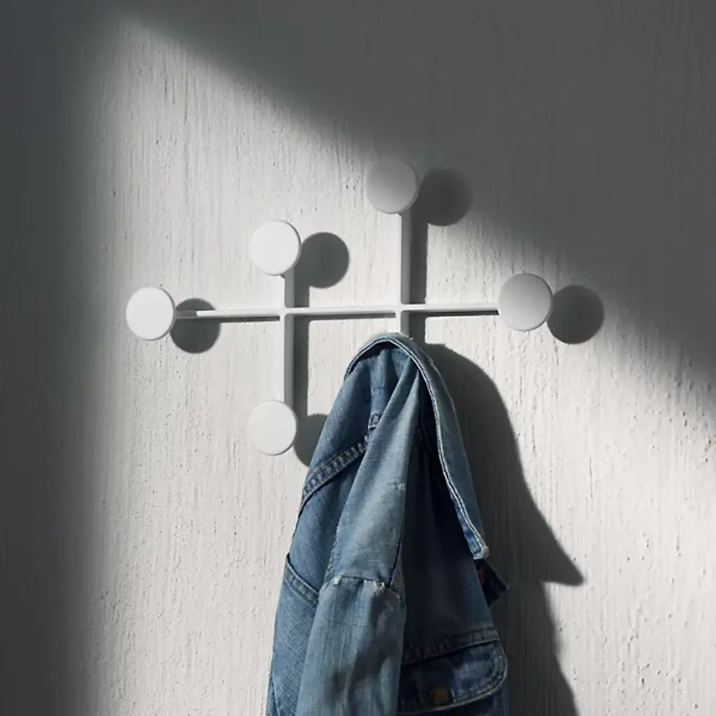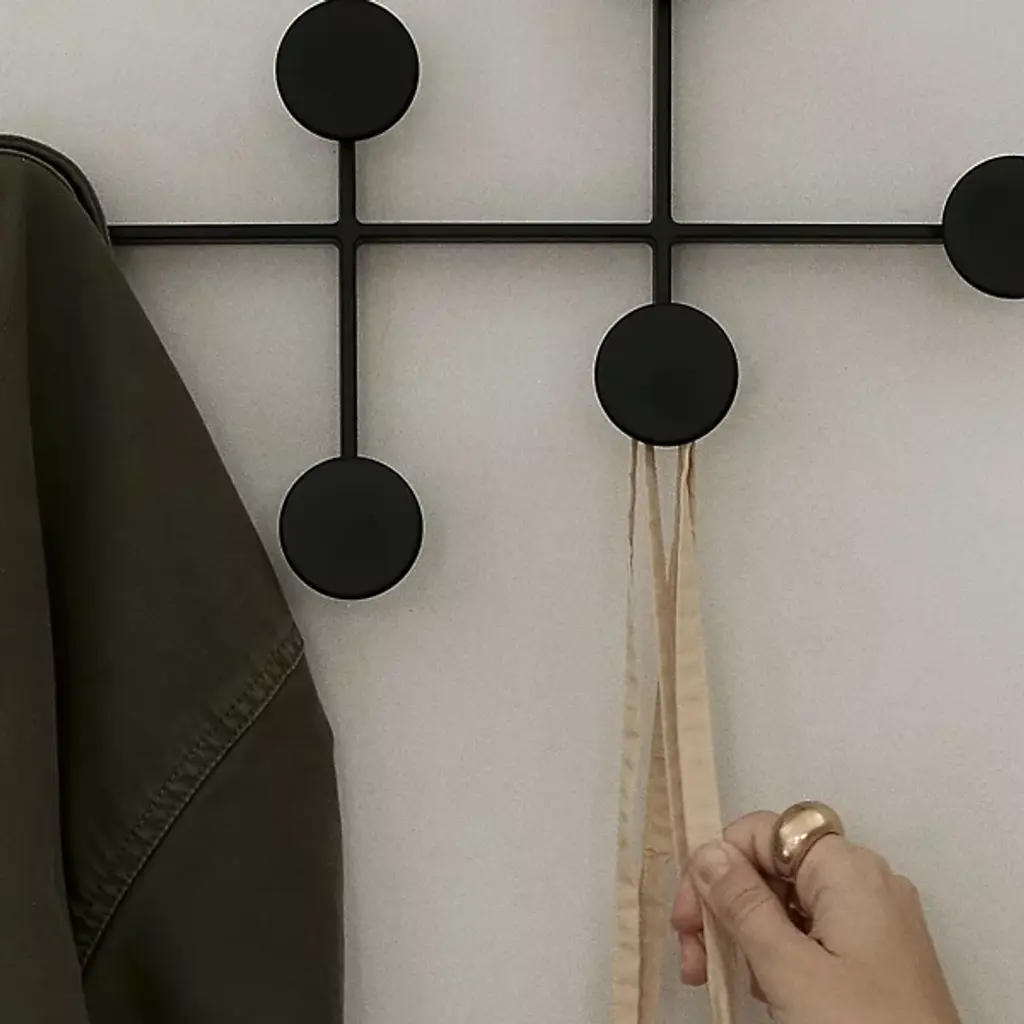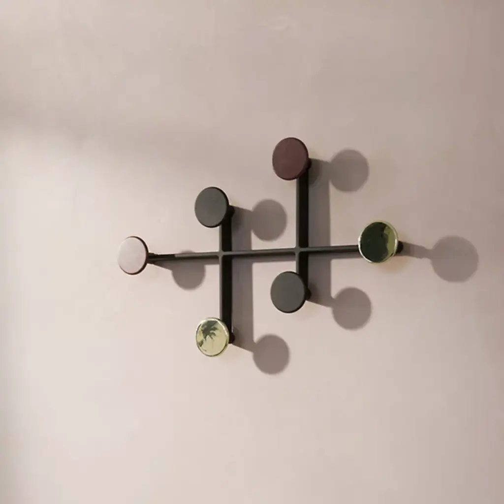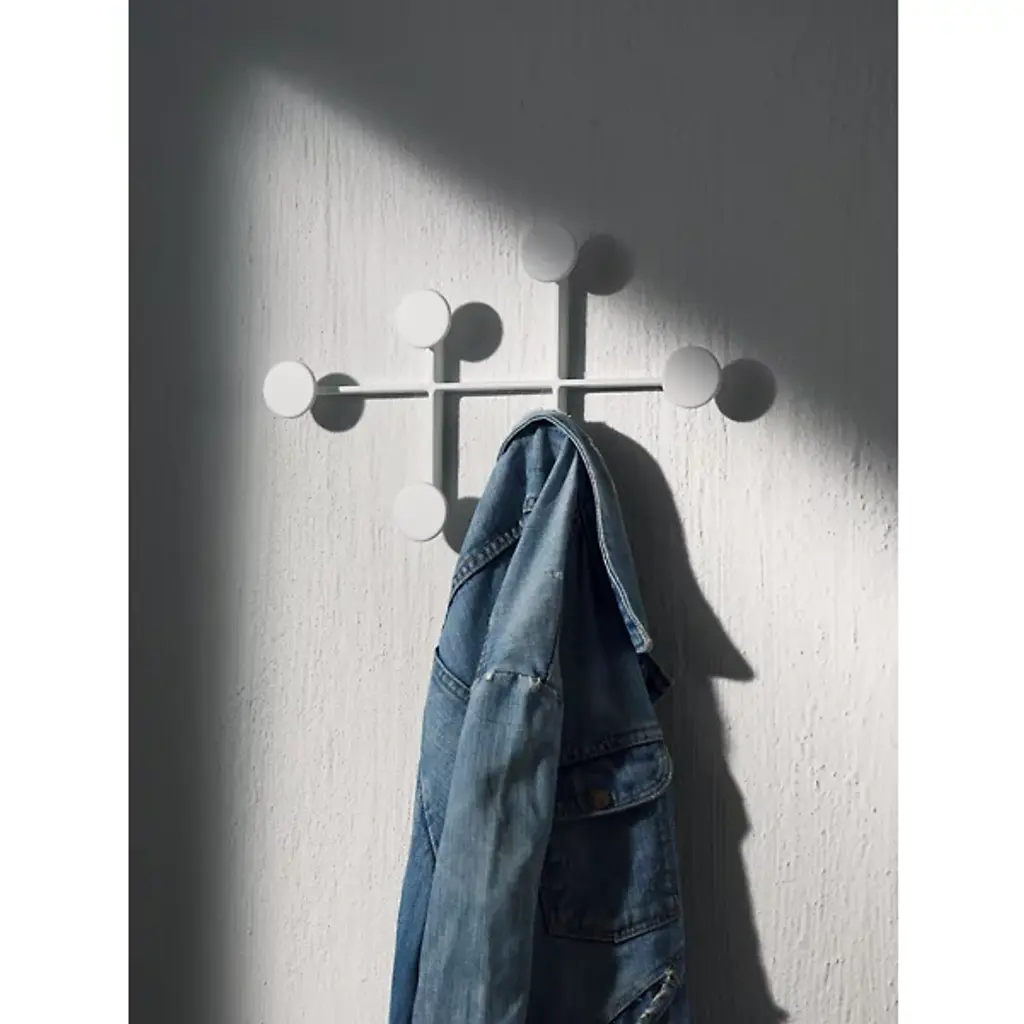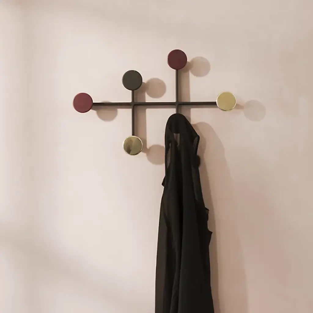 The Afteroom Coat Hanger by Audo Copenhagen, formerly known as Menu, is a simply sculptural coat rack designed by Afteroom. It takes inspiration from the Bauhaus movement and is made out of powder coated and/or brass-plated steel, with 6 dot-shaped hangers for coats, bags, hats, and more. To maintain the clean lines of the piece, the screws for mounting the rack to the wall are hidden inside its frame. Its zinc alloy quality adds durability.