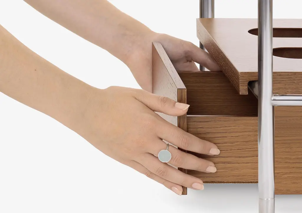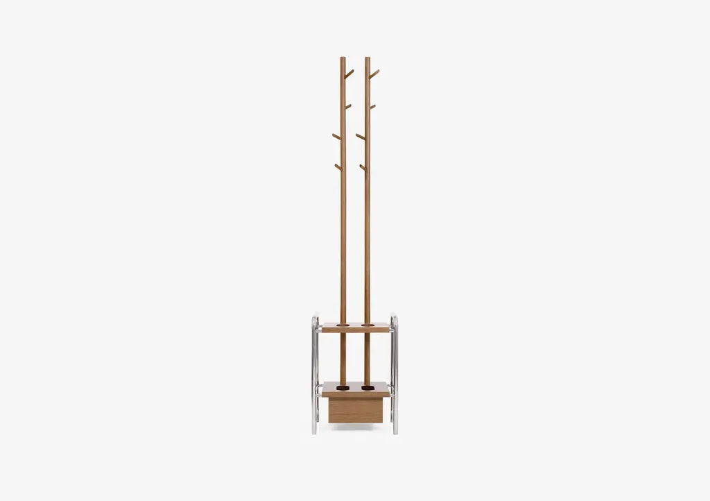 Coat stand composed of 1 polished stainless steel structure with fixed feet and 1 top in solid oak wood and MDF veneered with natural oak leaf. The Living tops have a recess that allows a simple fit into the structure and you can easily change the order of placement. This set includes: 1 Side table/coat stand structure with fixed feet - Polished stainless steel - Silver 1 Coat stand - Oak - Brown - Includes 2 coat hangers in the same finish of the tops and drawer with 1 water drip vase