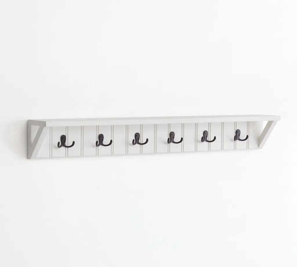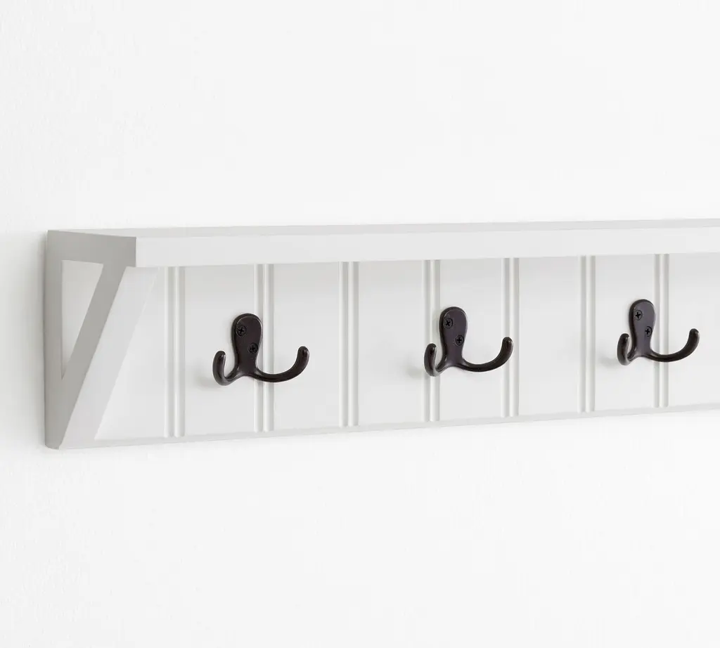 Designed with an eye toward traditional American style, our Aubrey Collection boasts handsome details and a Dutch White water-based finish. This row of hooks creates a centralized area for hanging coats, bags, leashes and more, and the overhead shelf makes a handy space for wallets, decor or a small potted houseplant. Like all the modular Aubrey components, it's crafted without return molding so it can fit flush next to other items in the collection to create a cohesive look.