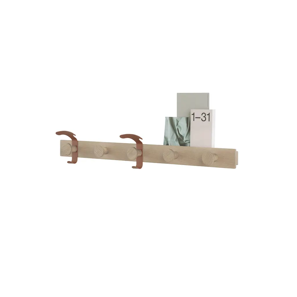 Designer duo Sam Hecht Kim Colin bring a fresh take to a standby necessity in Muuto’s mixed-material coat rack. Made from FSC-certified oak with matching wood pegs, it adds 2 movable steel hooks to reshuffle when hanging a specific item, be it a coat, a bicycle helmet, hat or a scarf. The powder-coated steel hooks can be positioned as desired from one wooden knob to another and the narrow unit also includes a ledge along the top for small keepsakes, a book or the odd photograph.