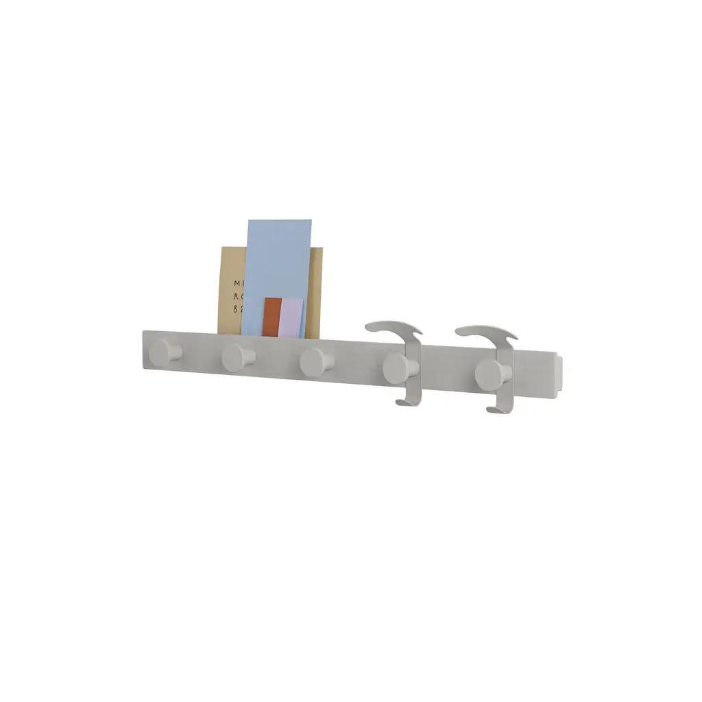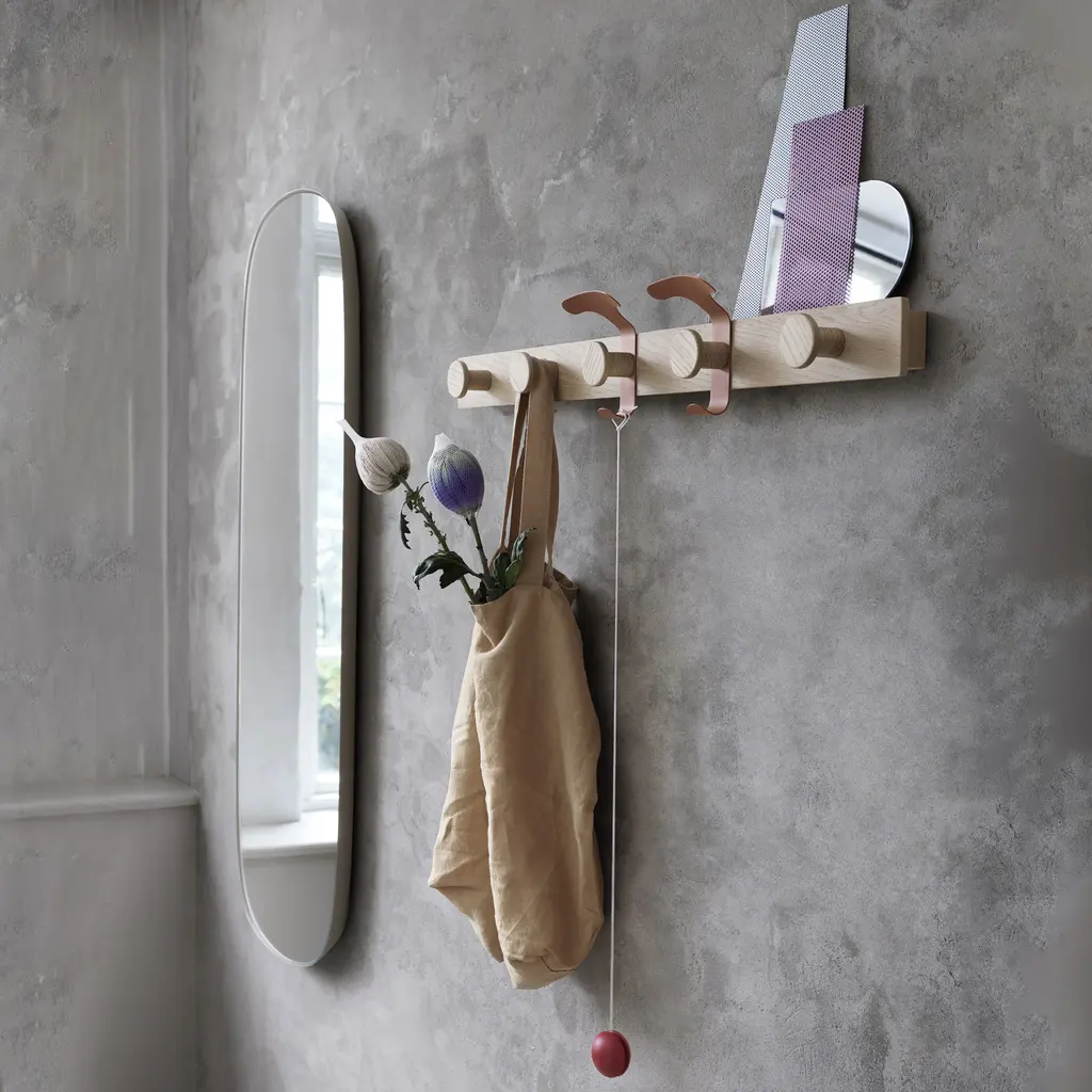 Designer duo Sam Hecht Kim Colin bring a fresh take to a standby necessity in Muuto’s mixed-material coat rack. Made from FSC-certified oak with matching wood pegs, it adds 2 movable steel hooks to reshuffle when hanging a specific item, be it a coat, a bicycle helmet, hat or a scarf. The powder-coated steel hooks can be positioned as desired from one wooden knob to another and the narrow unit also includes a ledge along the top for small keepsakes, a book or the odd photograph.