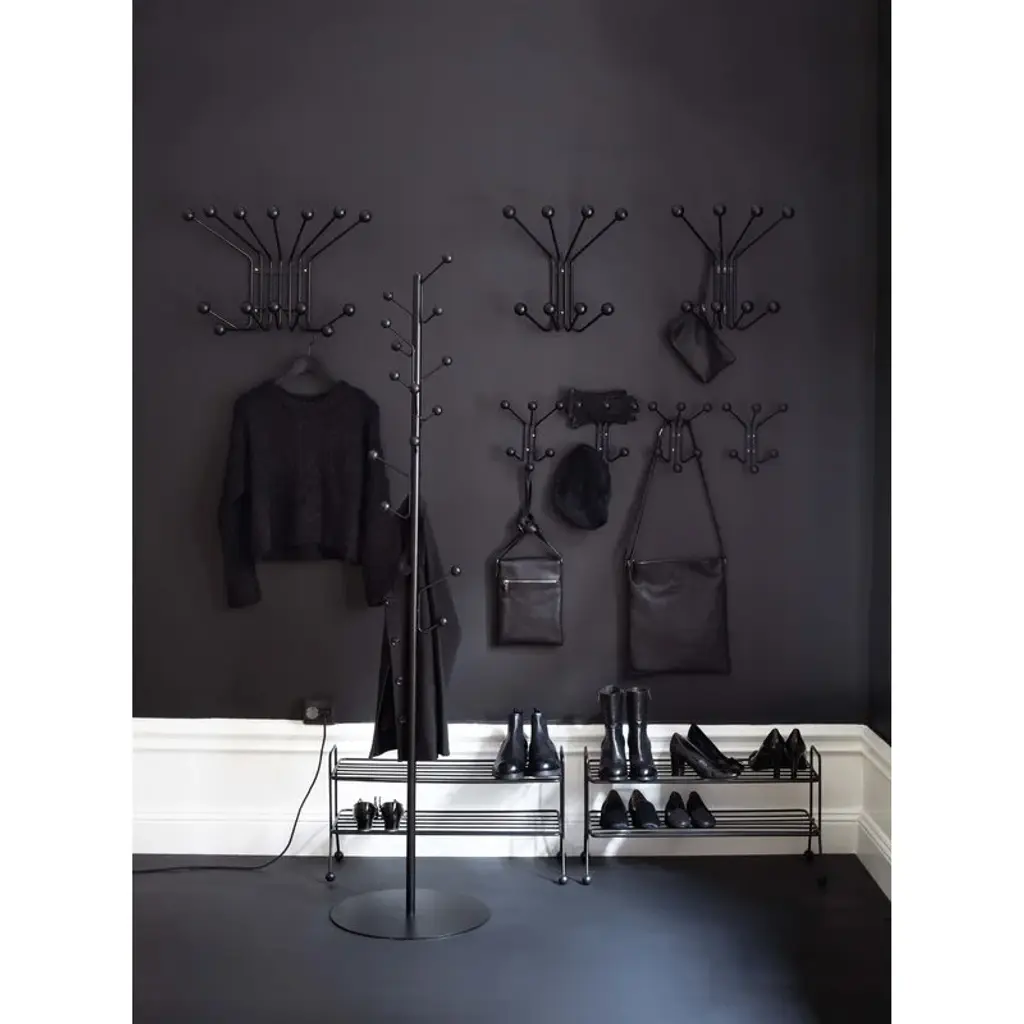 The wall-mounted coat rack Bill, designed by Louise Hederström for the Swedish Maze, is part of a collection of modern storage furniture characterized by a minimalist appearance that easily suits any hallway. The geometrical design of the Bill coat rack is a combination of a recycled metal frame and playful hooks perfected with round, wooden balls. Complement the storage style with other products from Maze’s Bill collection.