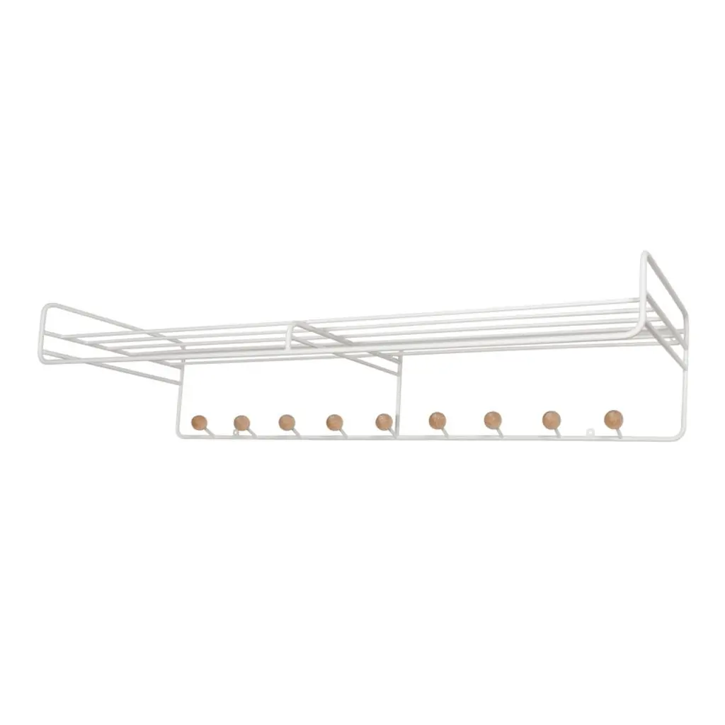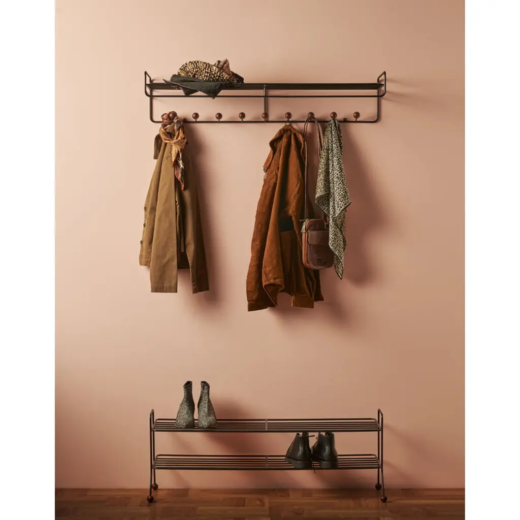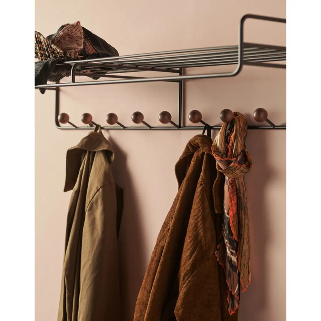 The Bill hat rack, designed by Louise Hederström for the Swedish Maze, is part of a collection of modern storage furniture characterized by a minimalist appearance that easily suits any hallway. The geometrical design of the wall-mounted Bill hat rack is a combination of a recycled metal frame and playful hooks perfected with round, wooden balls. Complement the storage style with other products from Maze’s Bill collection.