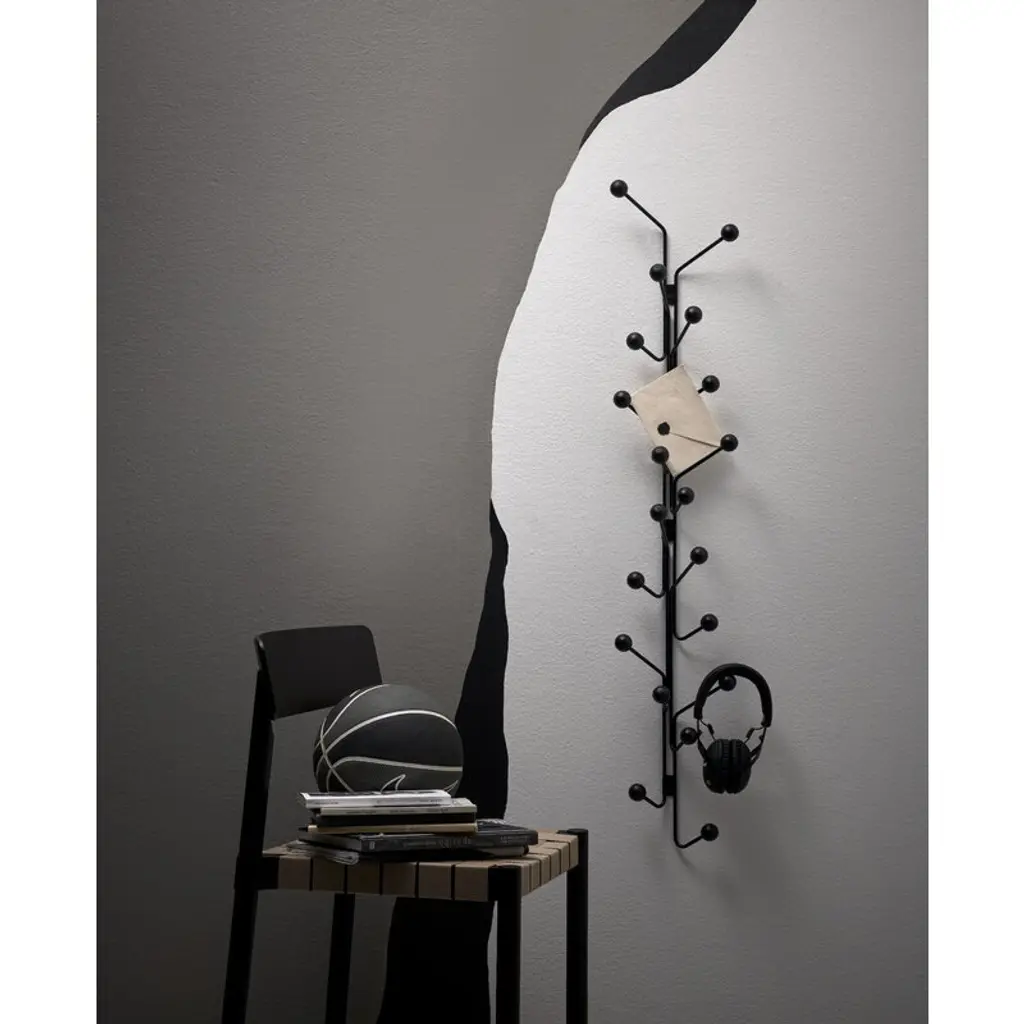 The Bill Vertical coat rack, designed by Louise Hederström for the Swedish Maze, is part of a collection of modern storage furniture characterized by a minimalist appearance that easily suits any hallway. The geometrical design of the wall-mounted Bill Vertical coat rack is a combination of a recycled metal frame and playful hooks perfected with round, wooden balls. Complement the storage style with other products from Maze’s Bill collection.