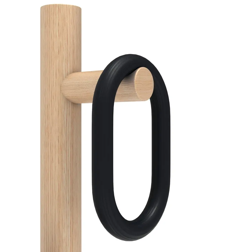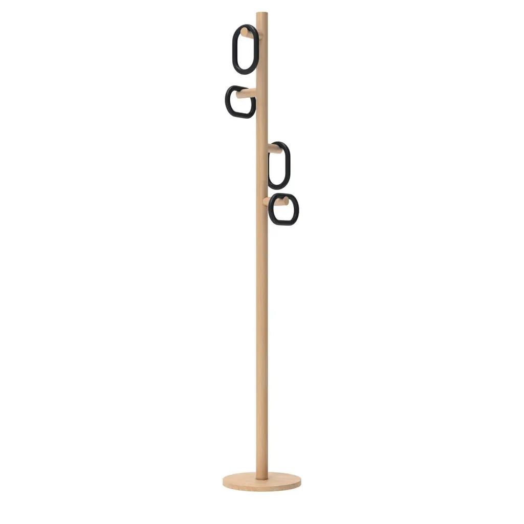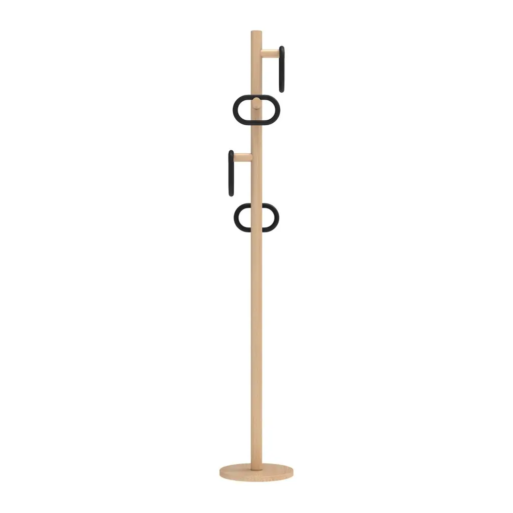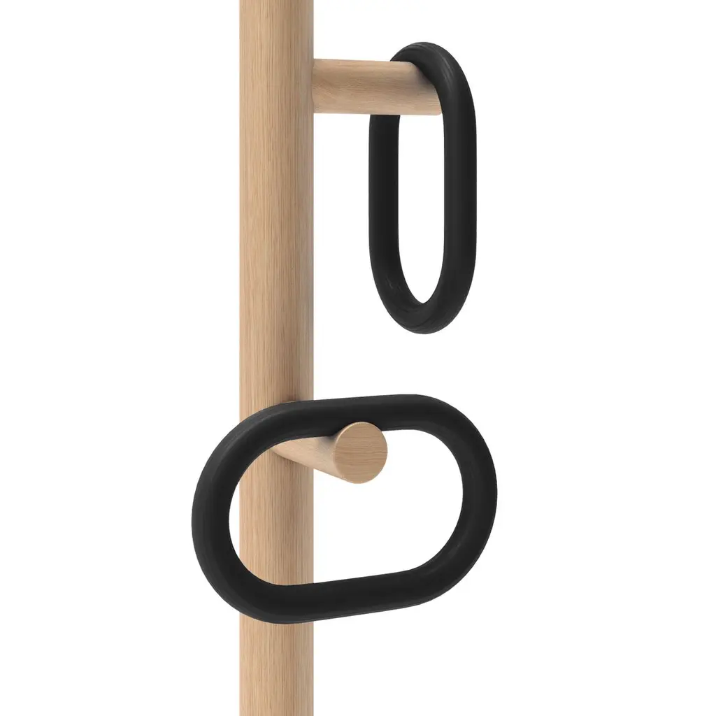 Black Fernand Coat Stand Natural Oak by HARTODimensions: W 30 x D 30 x H 180 cm. Materials: Solid Wood, Lacquered Plywood, Metal.Weight: 6.0 kgThe Fernand coat rack is as elegant as it is useful, halfway between sculptural geometry and functional furniture. Its rings offer multiple ways to hang or attach, and their very present oblong shape gives it all its irresistible appeal. Made in Portugal, the Fernand coat rack is made of solid wood and lacquered plywood. Fernand is a creation of AdriAn Blanc.About: Hartô, a French furniture brand, was born in 2012 from the desire of its founders to offer a different design, less elitist, which combines the useful with the beautiful. A light, joyful design, as if to say "I'm fed up" (with boring furniture): this is the meaning of the word harto in Spanish. The first pieces of the collection, the desks offer a new vision on a market that was then quite sparse, and offer functional tips and a joyful, colorful design, out of step with the archetypes. The foundations of the Hartô spirit are laid: a free spirit, a design of the useful, curved shapes, colors. In a word: creativity! And of course, from the beginning, this translates into collaborations with talented designers. This spirit crosses the years and the collections, evolves, refines itself, without ever denying itself. Today, audacity and creativity are still there, and are translated in a subtle way, all in elegance. At Hartô, the freedom to create is also based on strong commitments to quality and durability: the furniture is made by the best local craftsmen, who use noble materials to give life to pieces that will last through the ages.