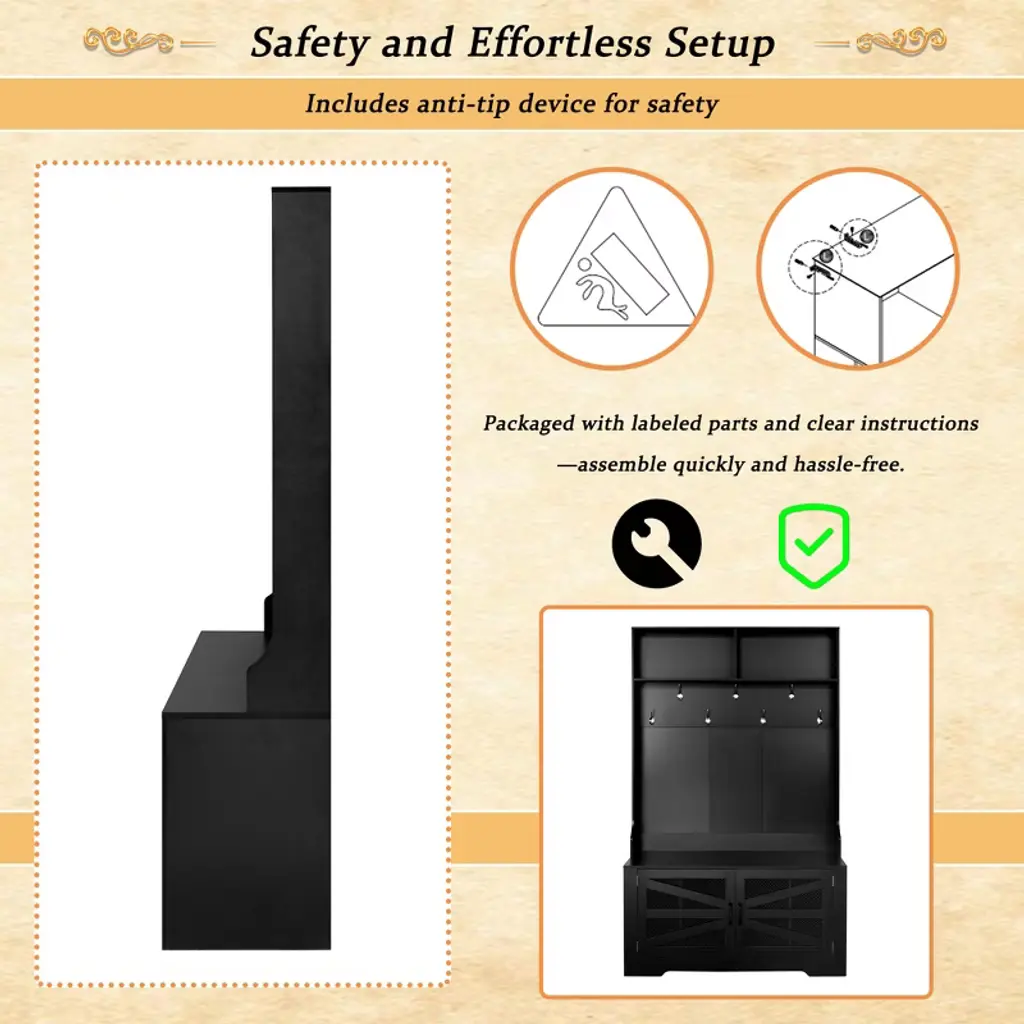 This multifunctional hall tree blends style and function with its elegant design and durable MDF construction. It features two spacious display shelves, seven sturdy hooks, a comfortable bench, and a ventilated cabinet with six adjustable shelves. Perfect for organizing your daily essentials, it includes an anti-tip device for added safety and assembles easily with included instructions.