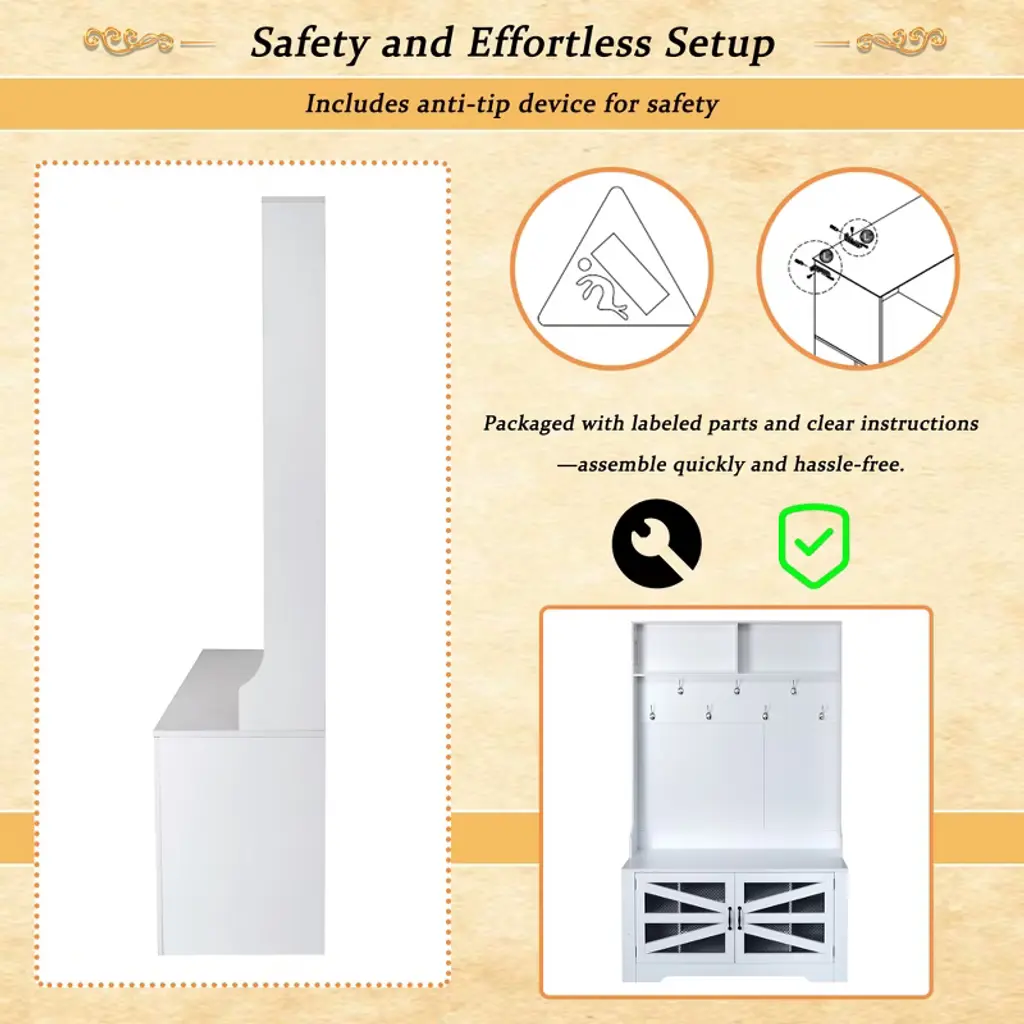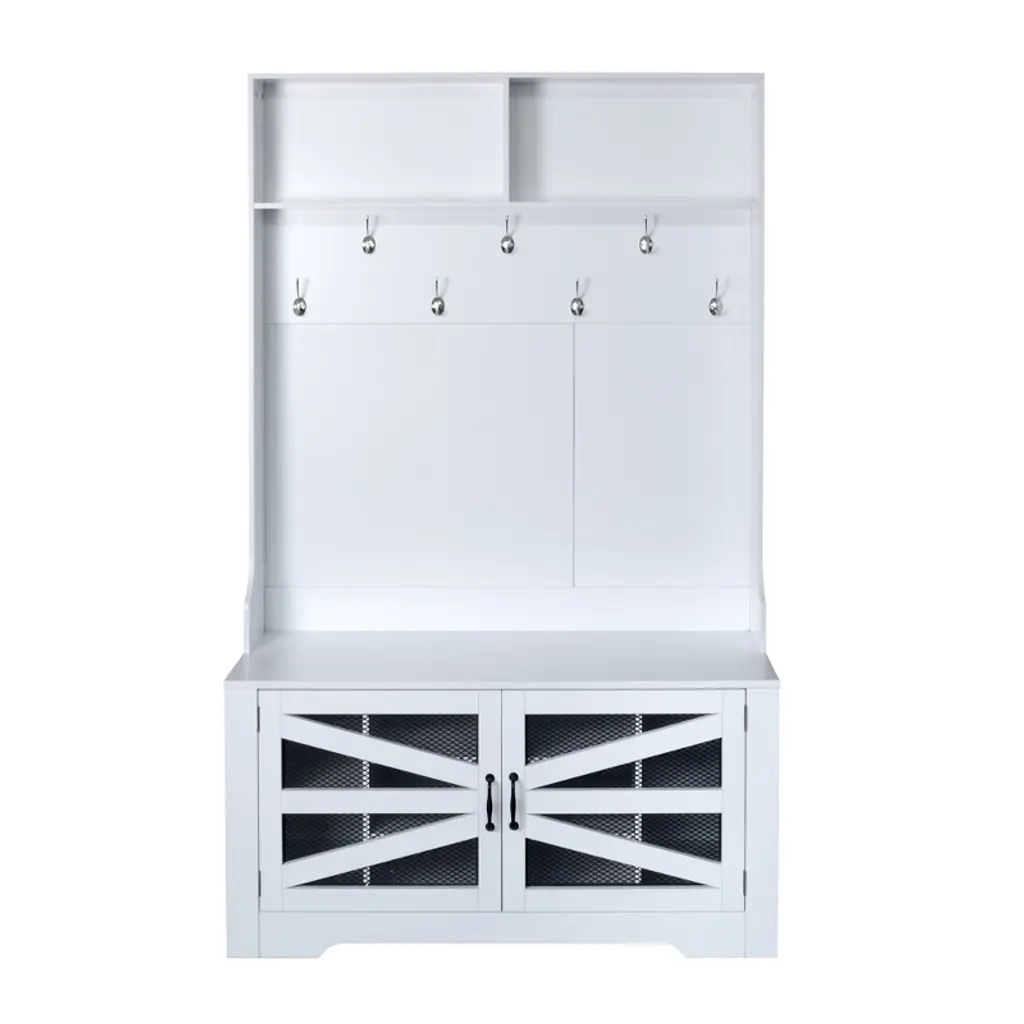 This multifunctional hall tree blends style and function with its elegant design and durable MDF construction. It features two spacious display shelves, seven sturdy hooks, a comfortable bench, and a ventilated cabinet with six adjustable shelves. Perfect for organizing your daily essentials, it includes an anti-tip device for added safety and assembles easily with included instructions.