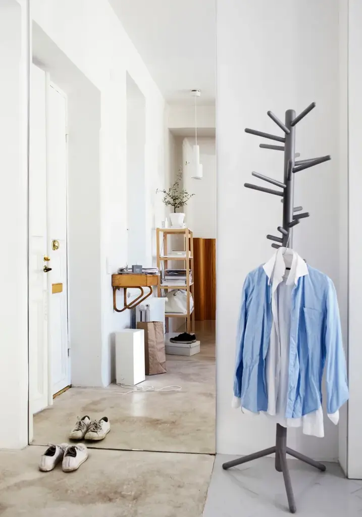 Elegant yet simple, the Clothes Tree is made of solid birch with metal feet. The highly utilitarian piece features pegs that are longer at the top and shorter at the bottom, allowing for easy organisation of items. Presented in a choice of finishes, the natural birch version is available with contrasting feet in either black or white. Distinctive in look, the Clothes Tree brings a hint of the forest to any interior.The clothes tree is available in different variants:Foot lacquered white, tree natural lacqueredFoot lacquered white, tree natural lacqueredFoot lacquered white, tree lacquered whiteFoot lacquered black, tree lacquered black