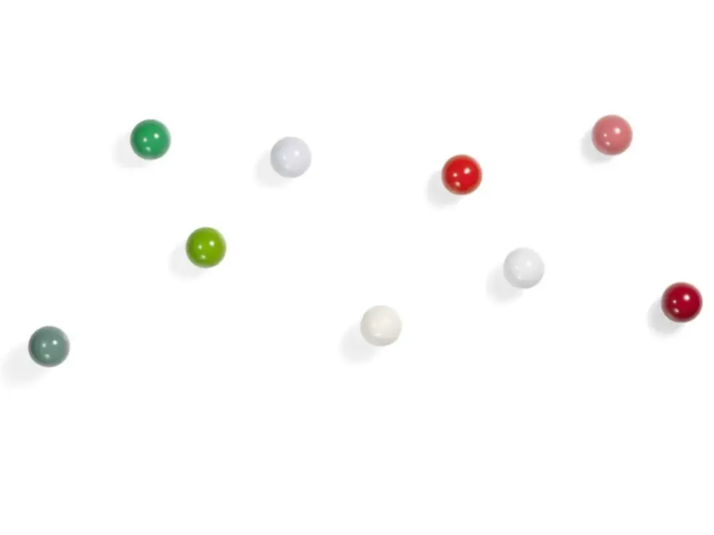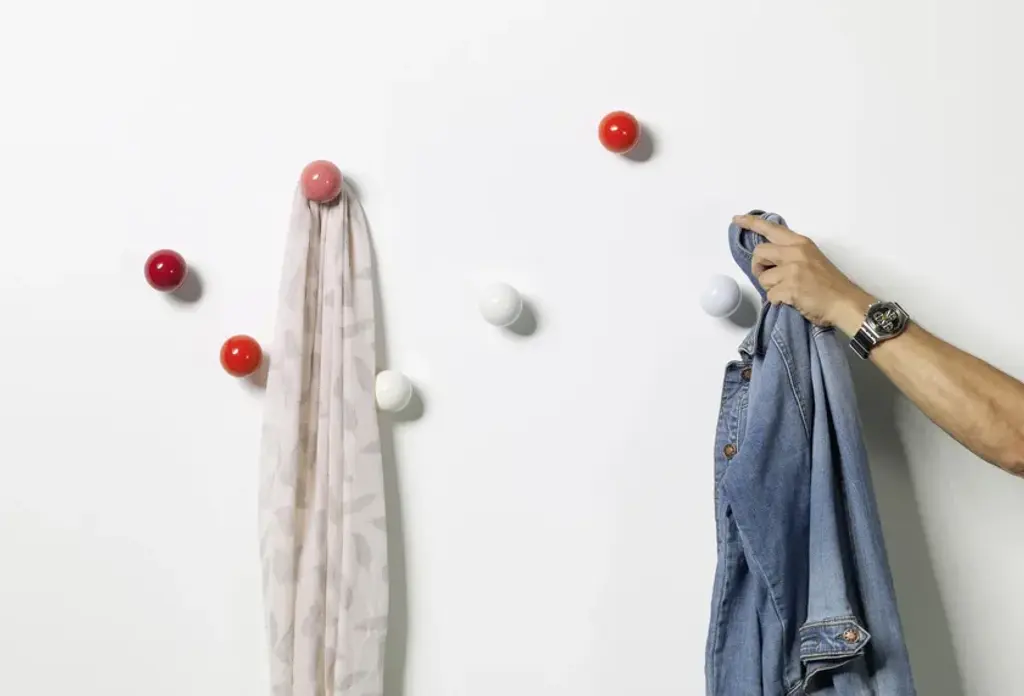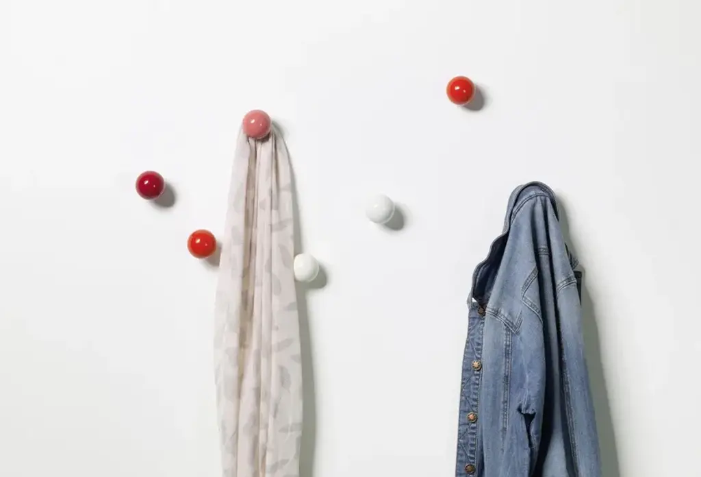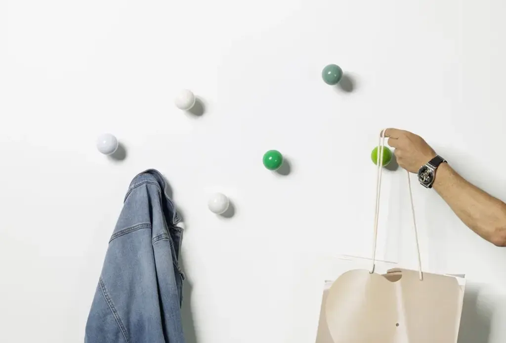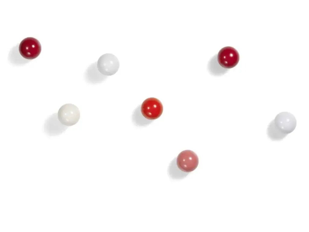 The Coat Dots by Hella Jongerius are mounted on an extendable pin that can be pulled slightly away from the wall to provide a handy peg for jackets and clothes hangers. At the same time, they can also simply be utilised as decorative wall elements. The Coat Dots are available in sets of three colour-coordinated balls including mounting material.Materials:- Balls: beech wood, painted in various colours.- Wall mount: aluminium.- Product contents: 3 balls, incl. screws and wall plugs for installation.- Origin of wood: beech (Fagus sylvatica) from Western Europe and/or Poland.