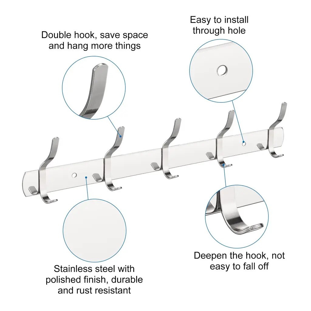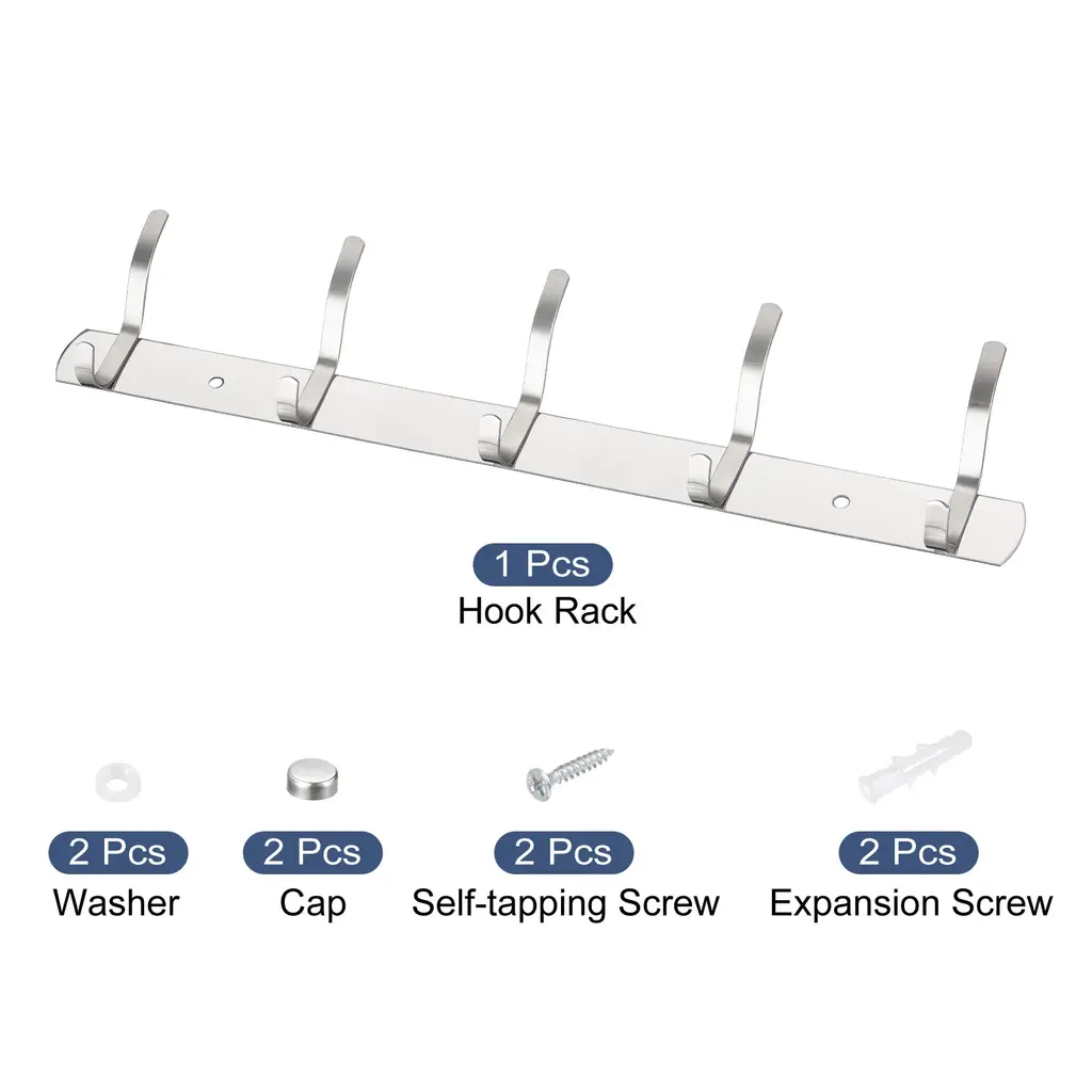 Description:1. Made of higher strength stainless steel with polished surface, it is durable and sturdy, not easy to deform. Rust and corrosion resistant, the wall hook is water proof and has a long service life.2. With smooth surface and strong bearing force, the hook won't hurt clothes and bags and can hang a lot of things. It can be used in a humid environment or outdoors and can be firmly fixed on the wall, will not fall easily.3. Suitable to keep your items and clothes organized, such as bag, pants, skirt, coat, hat, scarf, towel, umbrella, keys, and more. Can be used bedroom, living room, bathroom, cloakroom, kitchen, etc for home, office, shop, hotel etc.4. Easy to install and convenient to use. Wall mounted, package includes screws and dowels. First clean the wall and use the mounting parts to install it directly in the desired location. It will take a few minutes to install it on drywall or plaster walls.Specification:Finish: PolishedThickness: 1.2mmTotal Size: 370mmx30mm/14.57"x1.18"(LxW)Mounted Hole Diameter: 5mmPackage Content:1 / 2 pcs x Wall Hook
