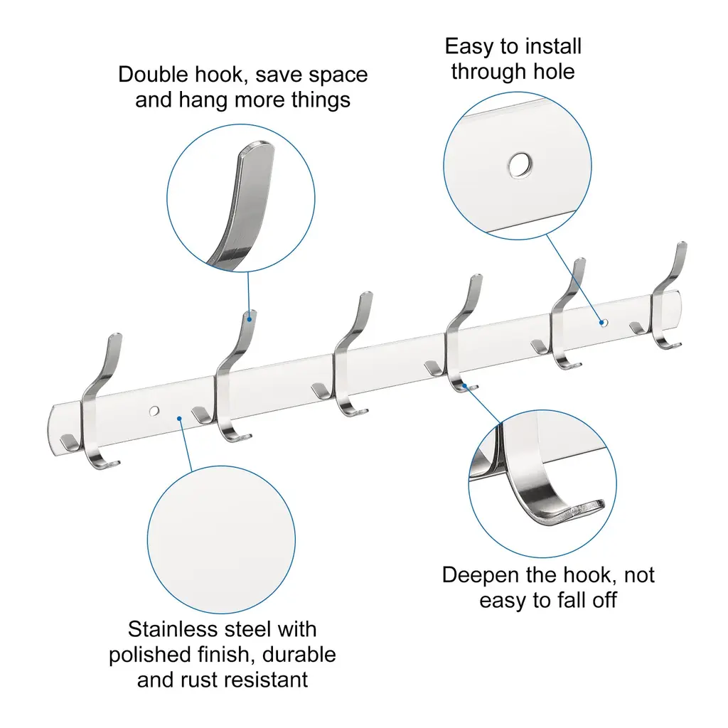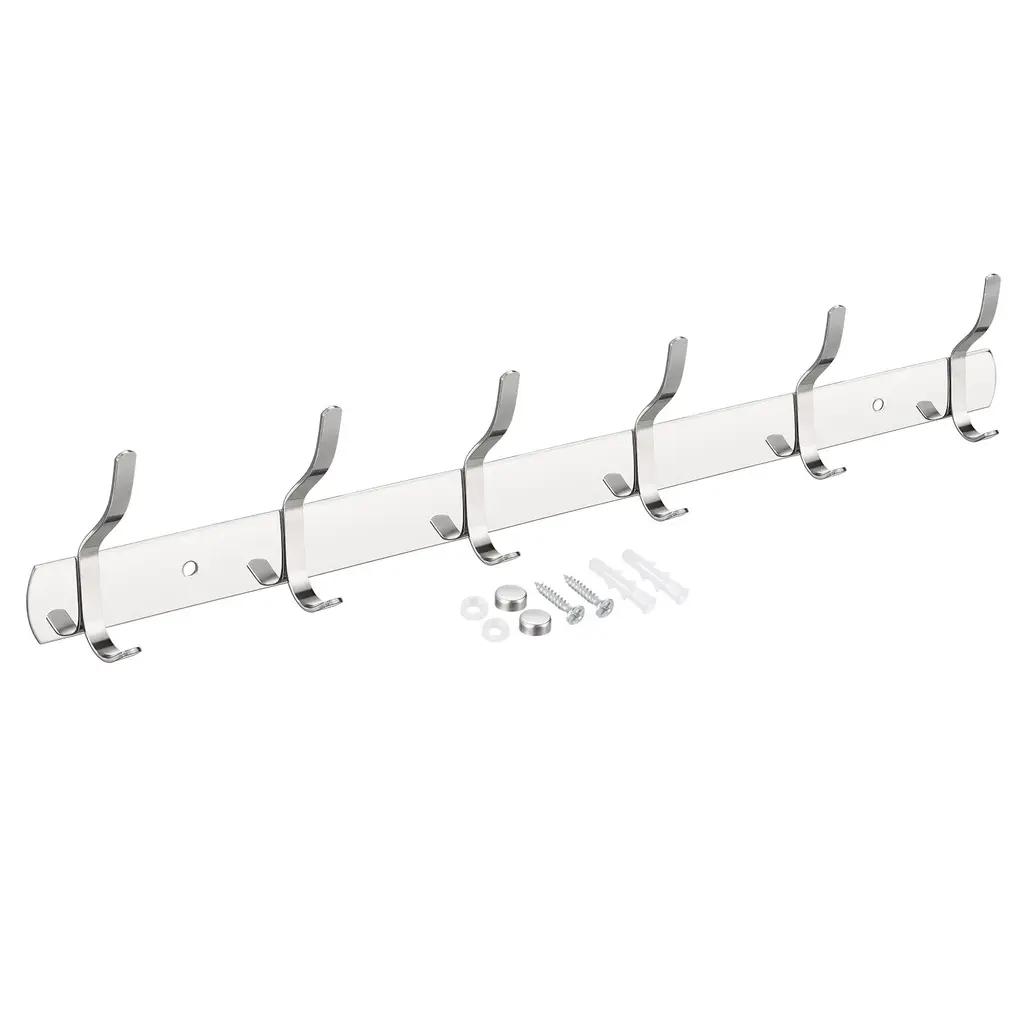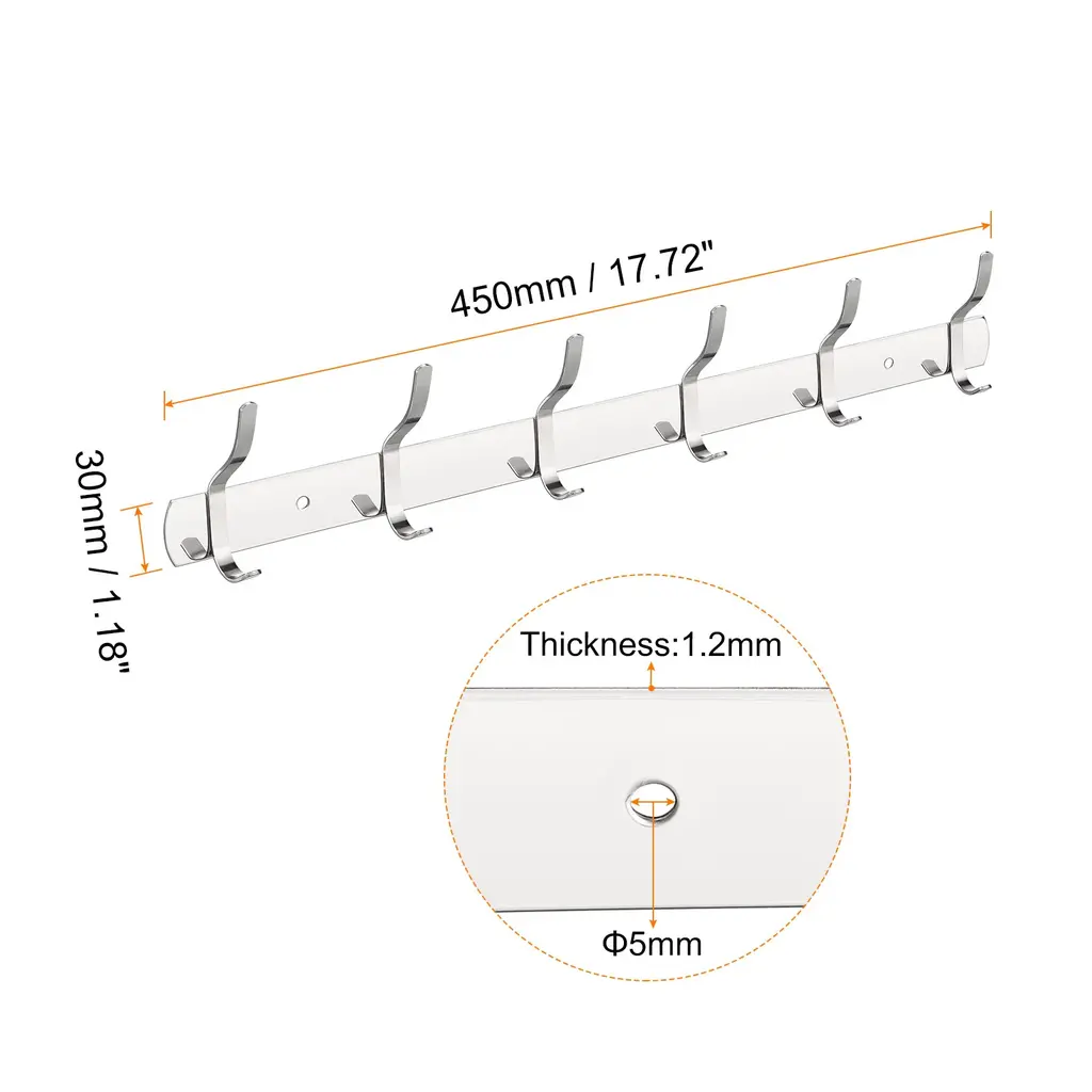 Description:1. Made of higher strength stainless steel with polished surface, it is durable and sturdy, not easy to deform. Rust and corrosion resistant, the wall hook is water proof and has a long service life.2. With smooth surface and strong bearing force, the hook won't hurt clothes and bags and can hang a lot of things. It can be used in a humid environment or outdoors and can be firmly fixed on the wall, will not fall easily.3. Suitable to keep your items and clothes organized, such as bag, pants, skirt, coat, hat, scarf, towel, umbrella, keys, and more. Can be used bedroom, living room, bathroom, cloakroom, kitchen, etc for home, office, shop, hotel etc.4. Easy to install and convenient to use. Wall mounted, package includes screws and dowels. First clean the wall and use the mounting parts to install it directly in the desired location. It will take a few minutes to install it on drywall or plaster walls.Specification:Finish: PolishedThickness: 1.2mmTotal Size: 450mmx30mm/17.72"x1.18"(LxW)Mounted Hole Diameter: 5mmPackage Content:1 /2 pcs x Wall Hook