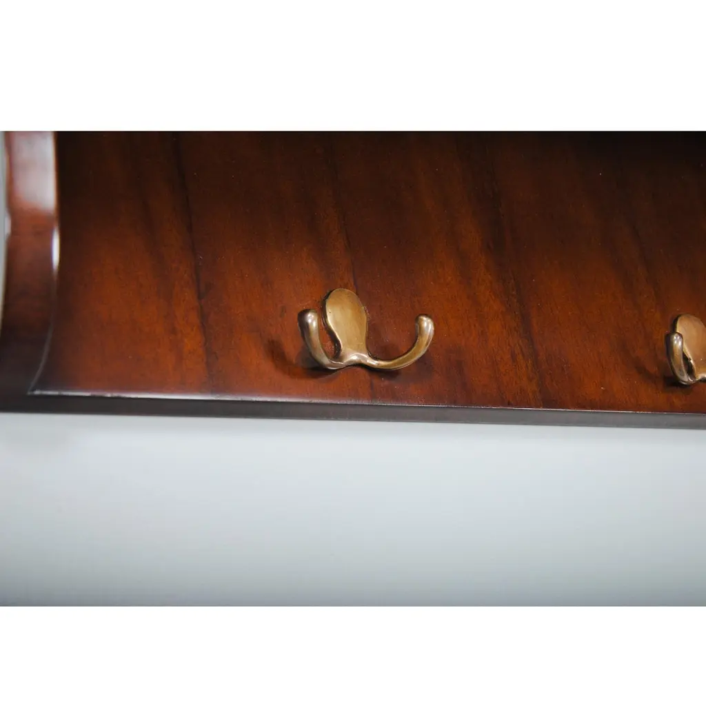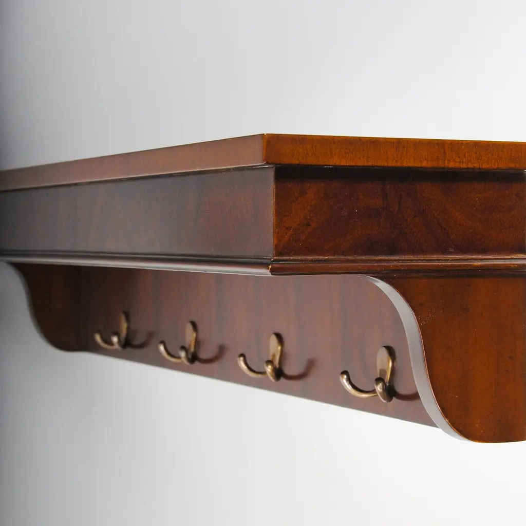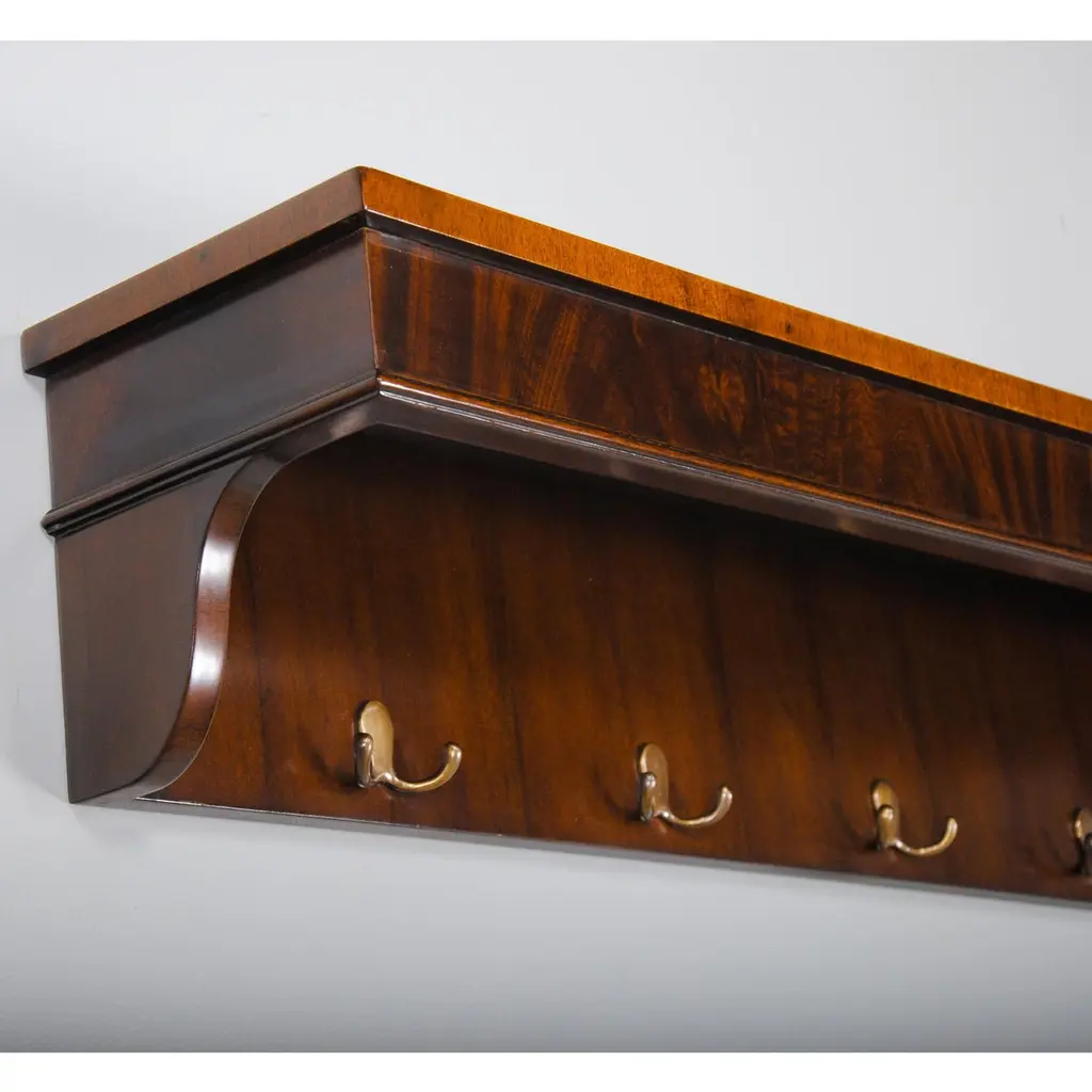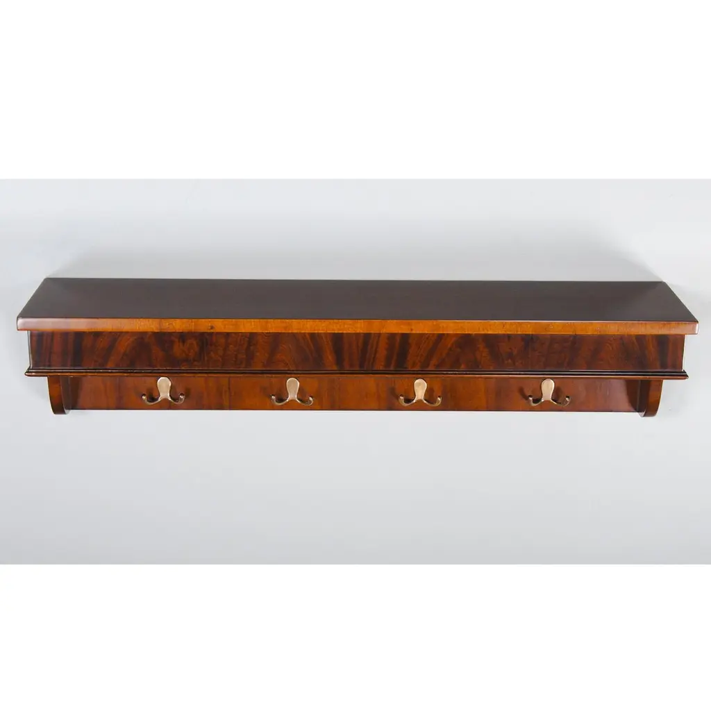 The Mahogany Coat Rack Shelf by Niagara Furniture is a great accessory that is both useful and decorative. Created from the finest mahogany solids and veneers the overall shape and style of the piece will fit in with almost any decor and add a little bit of elegance to any setting. Ideal for hanging coats in an entry way the Mahogany Coat Rack Shelf can also be utilized to hang such everyday items as car keys, backpacks, even kitchen utensils. The solid brass hangers are bolted through the back of the shelf to add strength and support. The flat top section of the shelf can be used to display and store items as well.The item ships complete with screws for mounting on a wall.Measures 36″w x 8″d x 8″h metric 91 20 20