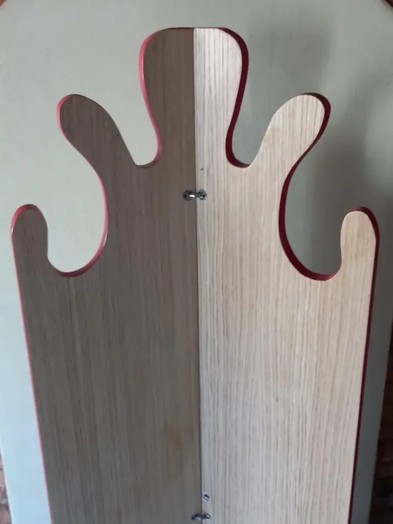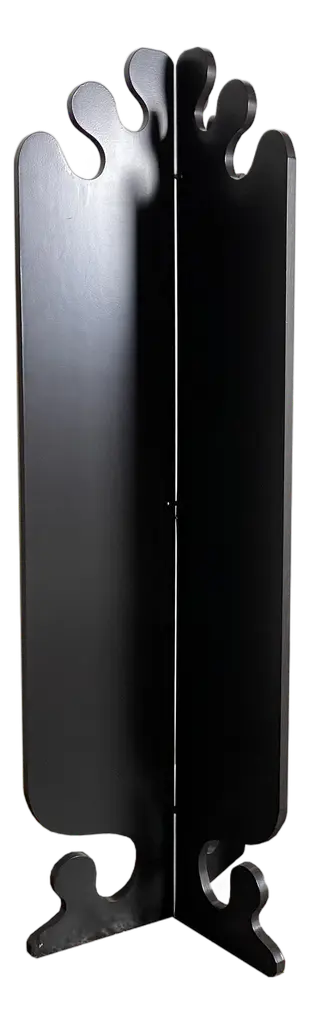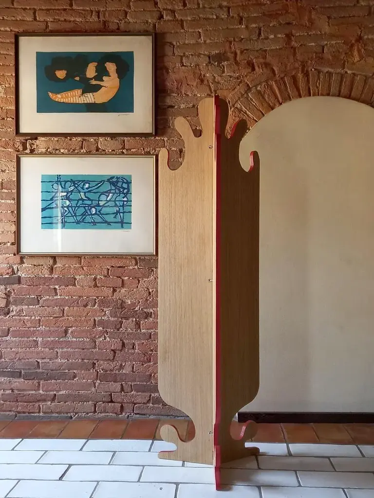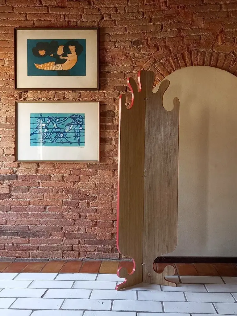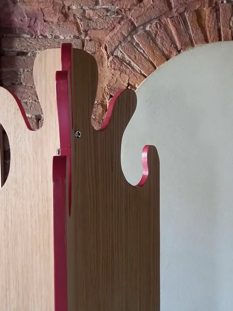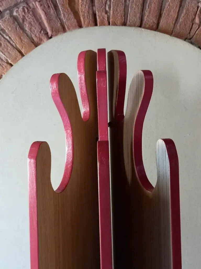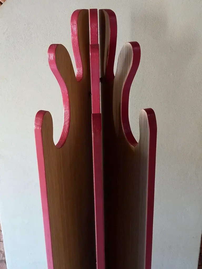 Coat rack by Ferdinando Meccani, 1976. To celebrate our 75th anniversary (1950-2025), we're reissuing this design object, originally designed by Ferdinando Meccani in 1976. Limited edition of 10/2025, made of oak with colored edges. The three elements that form the coat rack can be adjusted in various positions and can be folded together like a book. Signed by Maker,Stamped by Maker