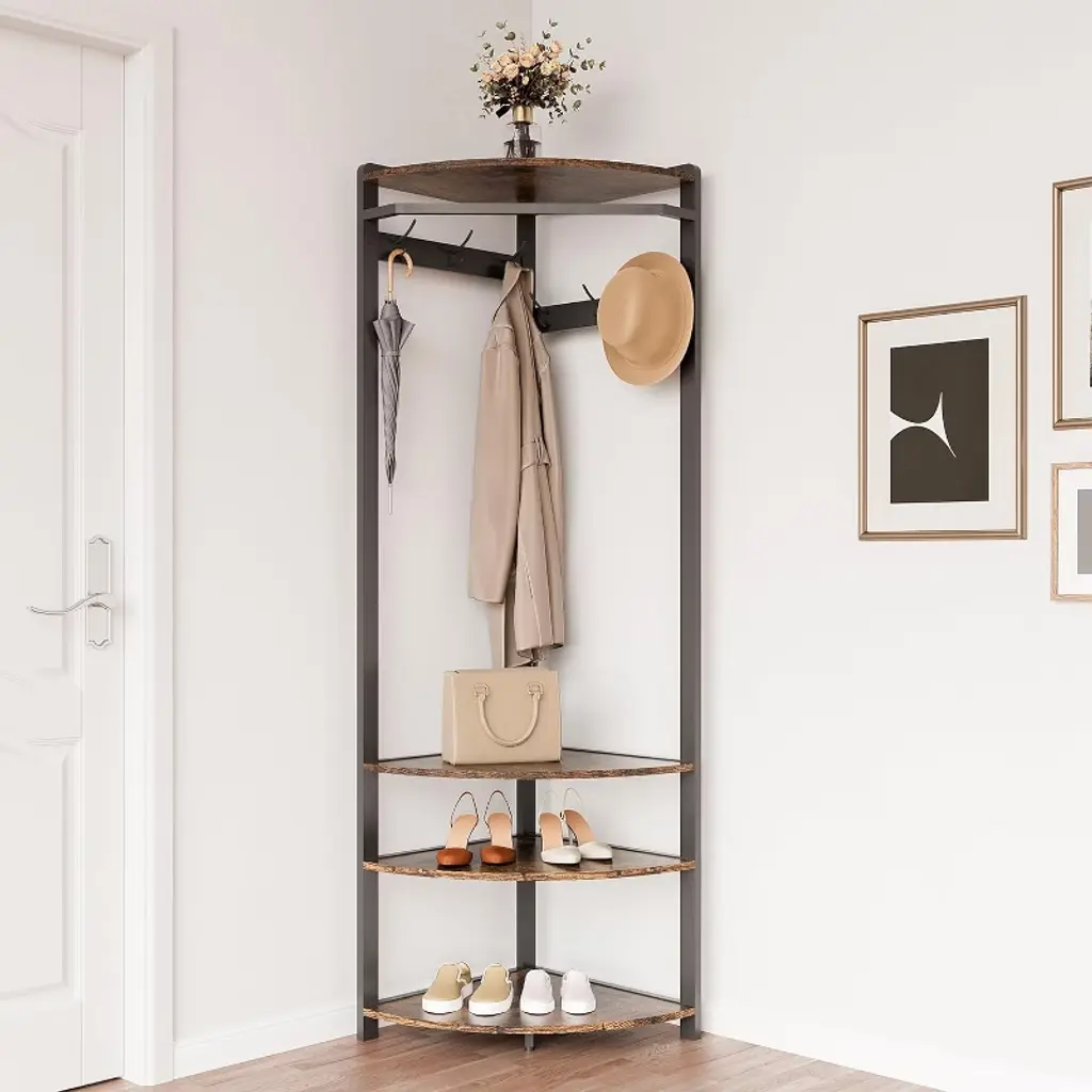 Multi-functional Corner Coat Rack - Our 3-in-1 narrow Corner Coat Rack combines a coat rack, shoe rack and top storage rack. The clothes hanging rod, with 6 double hooks, provides plenty of space for your daily hanging options and keeps your entrance area tidy, making it a home organizer for your entrance, bedroom, and living room. 90° Angle Corner Storage Rack - Corner hall tree Take advantage of limited corner space, the 70.8 inch tall design corner hall tree is suitable for hanging clothes of various heights. Ideal for entrance, living room, bedroom and dressing room. Anti-Tipping Design - The corner clothes rack with Shoe Bench Entryway adds four corners to the bottom of the tree to ensure that it does not shake, and the top adds two anti-tilting device to make the whole more stable, so that you can rest assured every time you use it. Space-Saving Corner Hall Tree - The top hooks of the corner coat rack with storage can hold umbrellas, coats, or hats. This multifunctional garment rack is suitable for most corners of your home space. The entryway bench maximizes your space perfectly while keeping your home tidy. It is not only practical but also an elegant addition to any room.