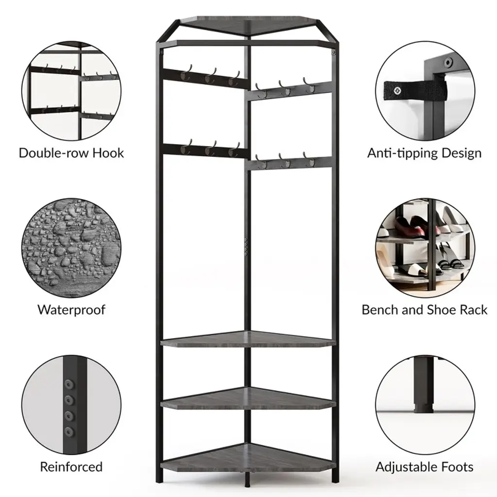 Introducing our versatile Corner Coat Rack With Shoe Bench, designed to maximize your entryway space while keeping your home organized and stylish. This 3-in-1 narrow corner hall tree combines a coat rack, shoe bench, and top storage shelf, making it an essential addition for your entrance, bedroom, living room, or closet.Featuring a 90° angle design, this corner hall tree fits perfectly into tight spaces, measuring 70.8 inches tall to accommodate clothes of various lengths. The clothes hanging rod is equipped with 6 double hooks, providing ample space to hang coats, hats, scarves, and umbrellas. The sturdy shoe bench offers convenient storage to keep your footwear organized and easily accessible.Safety and stability are paramount with our anti-tipping design. Four corner supports at the base and two anti-tilt devices at the top ensure the rack remains steady and secure, giving you peace of mind every time you use it.This space-saving corner coat rack not only provides practical storage but also adds a touch of elegance to any room. The multifunctional design allows you to maximize your available space while maintaining a tidy and welcoming environment.Installation is quick and hassle-free. Most parts can be assembled by hand with detailed instructions, numbered components, and all necessary tools included. Should you have any questions or need assistance, our dedicated customer service team is ready to help.Upgrade your home organization with our Corner Coat Rack With Shoe Bench — the perfect blend of functionality, stability, and style for any modern living space.