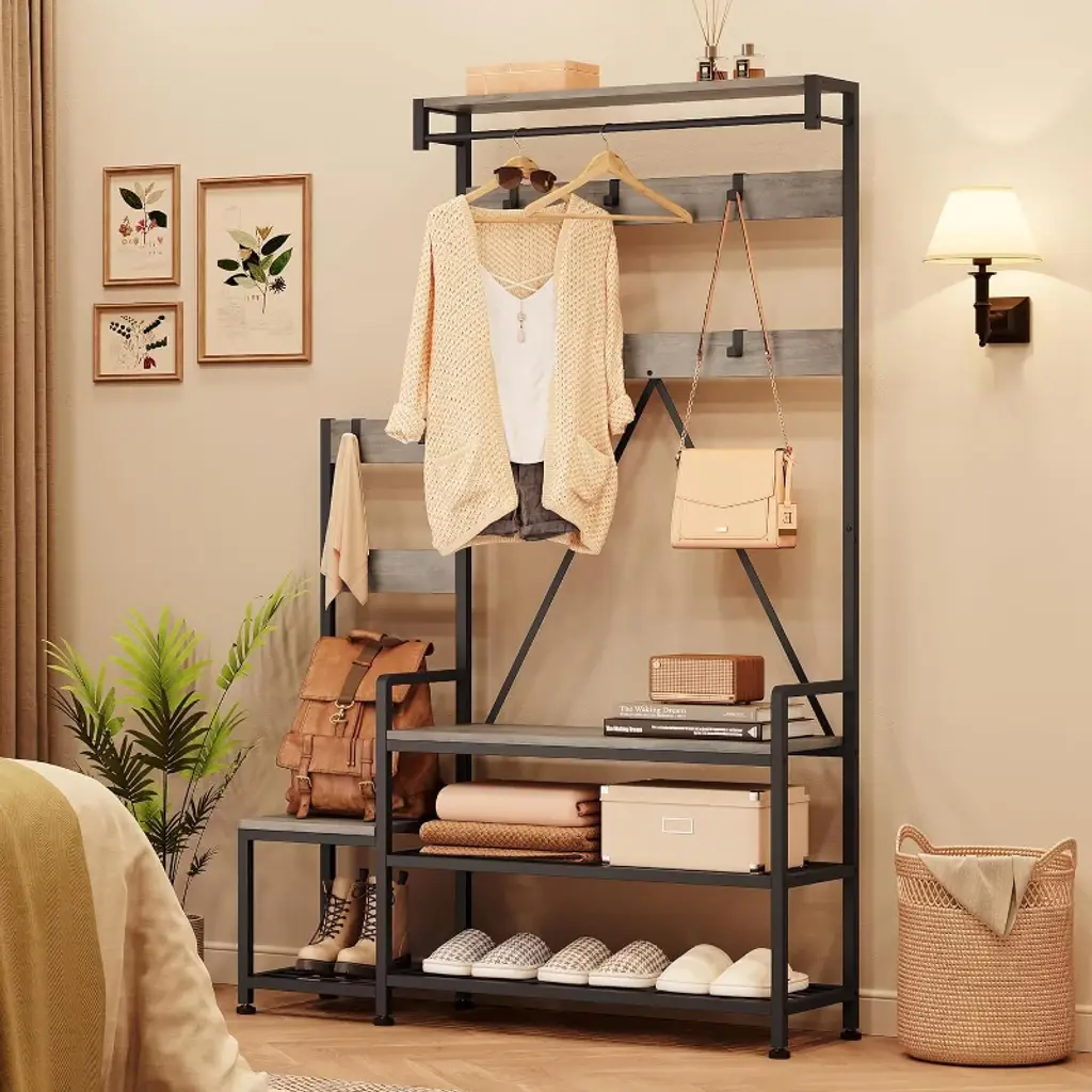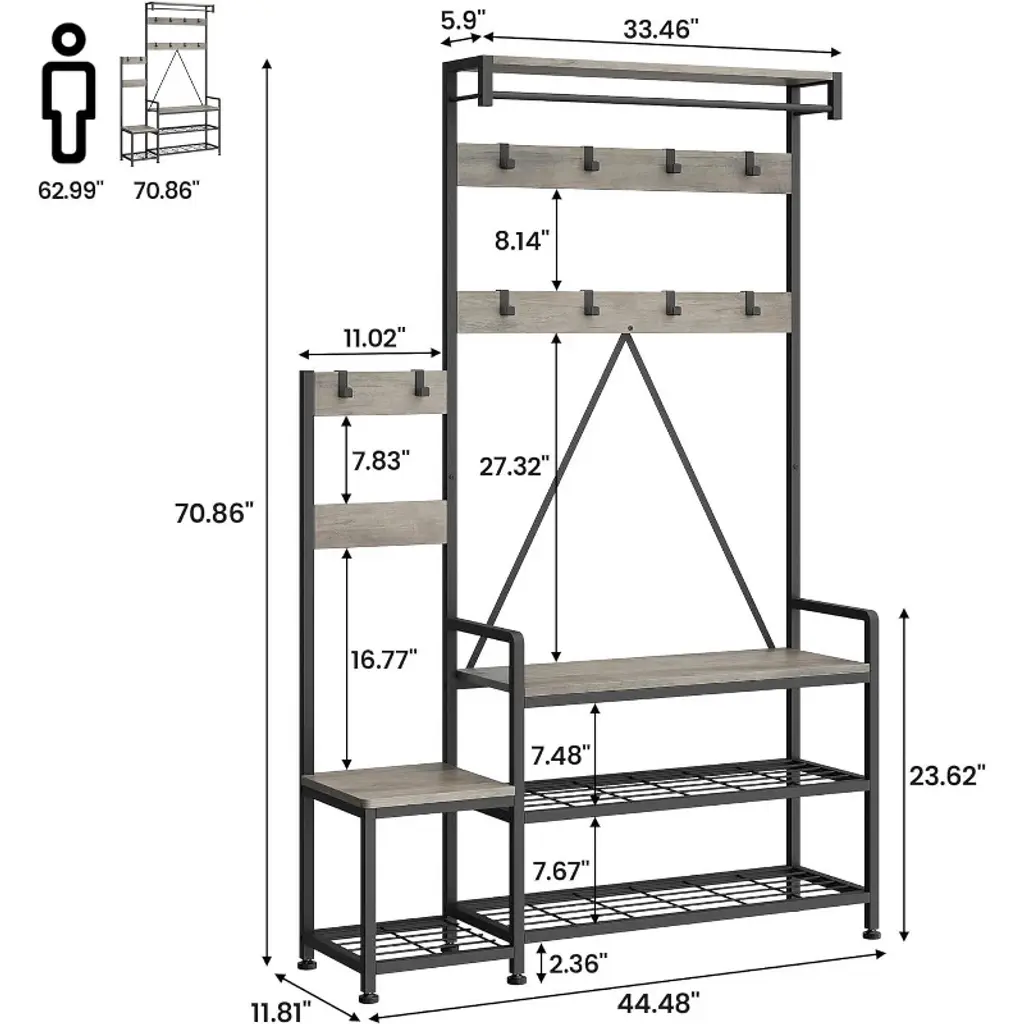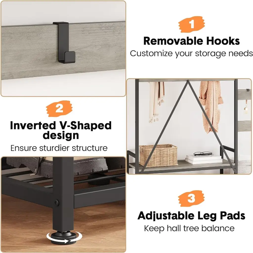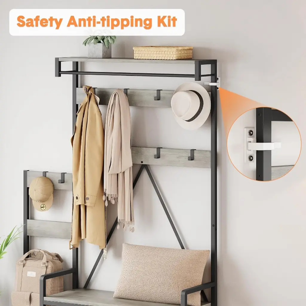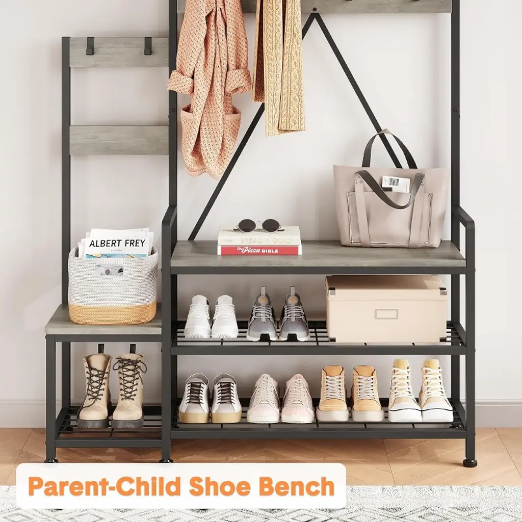 Bring family-friendly organization to your home with the COZONY parent-child hall tree with shoe storage bench. Measuring 44.49" W x 11.81" D x 71.26" H, this innovative coat rack features zoning for both adults and children, offering a full-size hanging area for grown-ups and mini storage areas for kids. Built with a durable MDF board and reinforced metal frame, it supports up to 300 lbs and includes inverted V-shaped supports, anti-tip straps, and adjustable feet for enhanced stability. The multifunctional design combines removable hooks, a hanging rail, a bench seat, open shelves, and a multi-level shoe rack to keep coats, shoes, and bags neatly stored. The industrial grey, brown, and black finish blends seamlessly into entryways, hallways, bedrooms, or living rooms. Easy to assemble with illustrated instructions and modular parts, this coat rack offers a practical and stylish solution for the whole family while promoting organization habits.