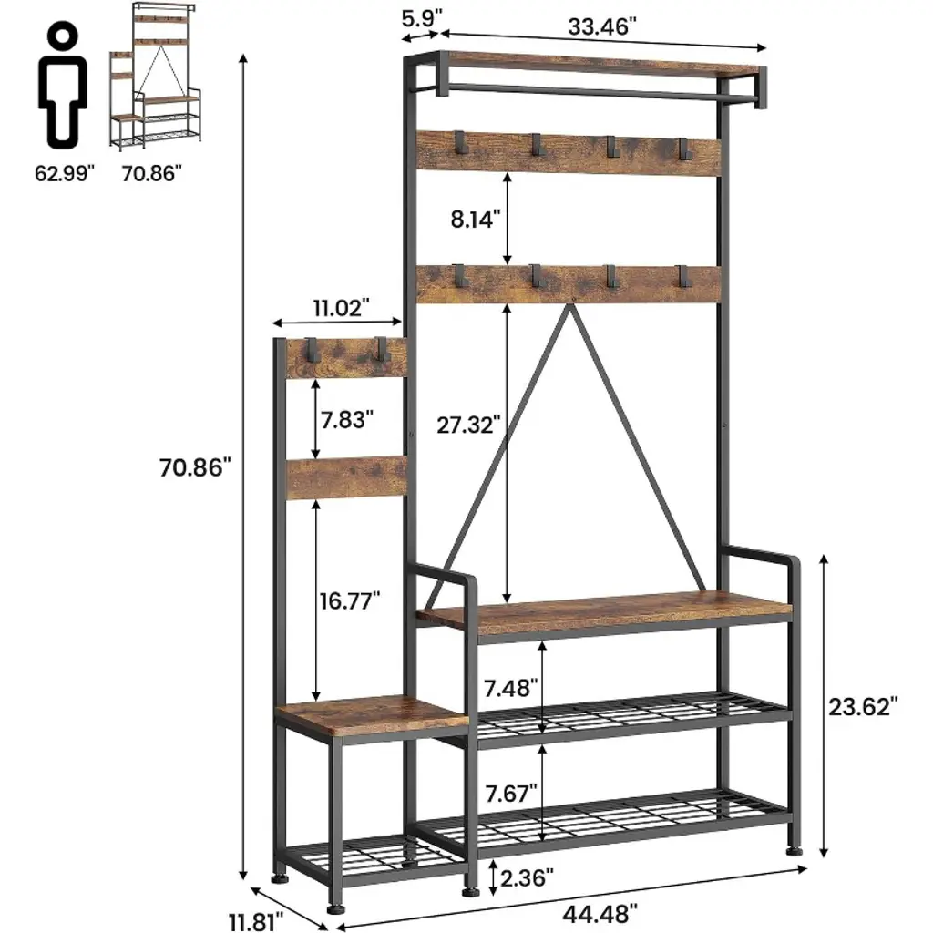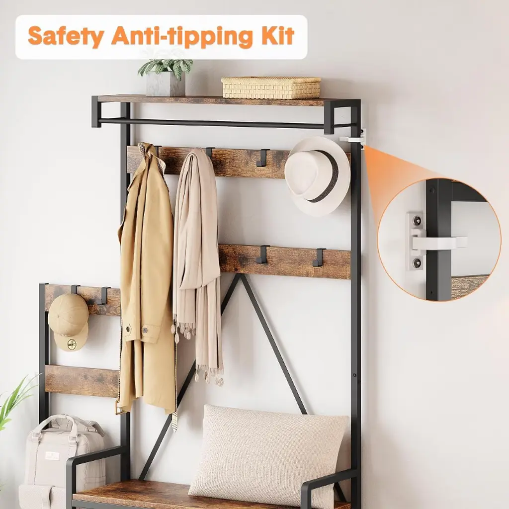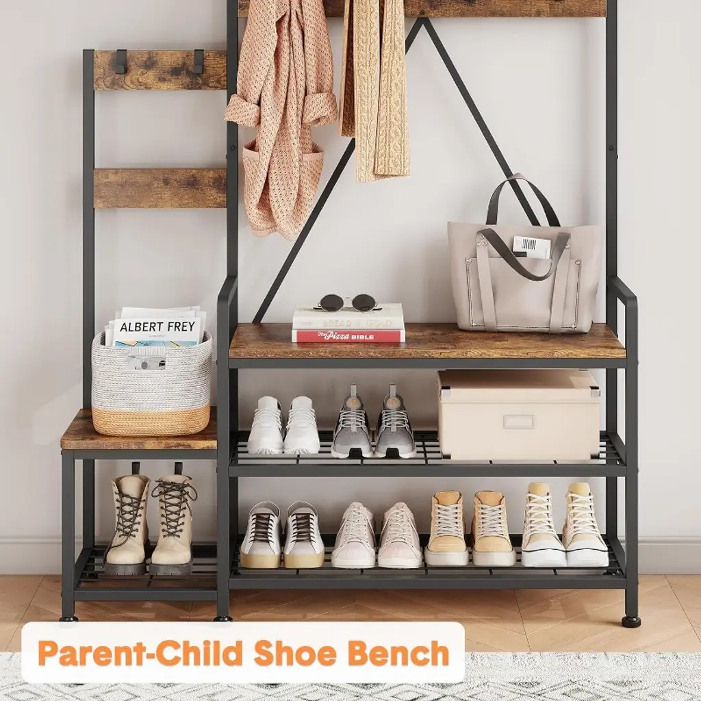 Bring family-friendly organization to your home with the COZONY parent-child hall tree with shoe storage bench. Measuring 44.49" W x 11.81" D x 71.26" H, this innovative coat rack features zoning for both adults and children, offering a full-size hanging area for grown-ups and mini storage areas for kids. Built with a durable MDF board and reinforced metal frame, it supports up to 300 lbs and includes inverted V-shaped supports, anti-tip straps, and adjustable feet for enhanced stability. The multifunctional design combines removable hooks, a hanging rail, a bench seat, open shelves, and a multi-level shoe rack to keep coats, shoes, and bags neatly stored. The industrial grey, brown, and black finish blends seamlessly into entryways, hallways, bedrooms, or living rooms. Easy to assemble with illustrated instructions and modular parts, this coat rack offers a practical and stylish solution for the whole family while promoting organization habits.