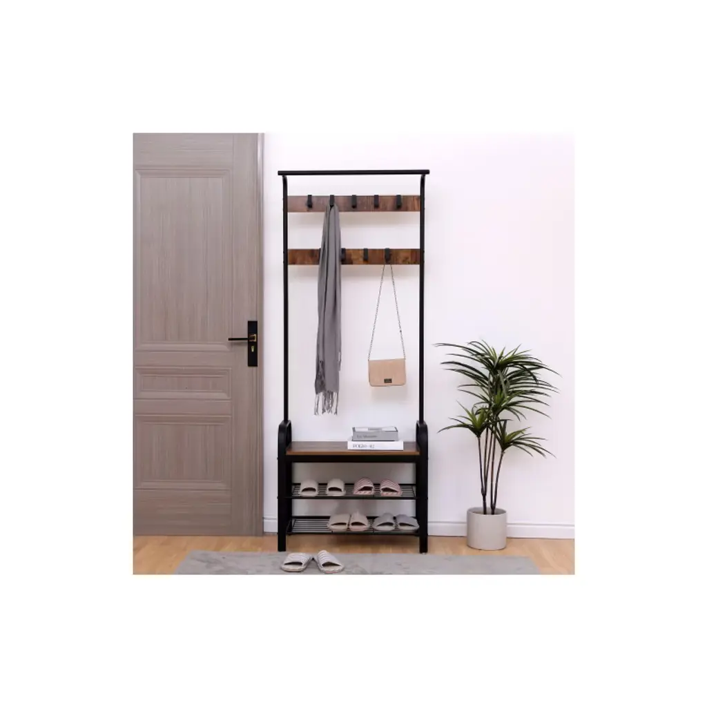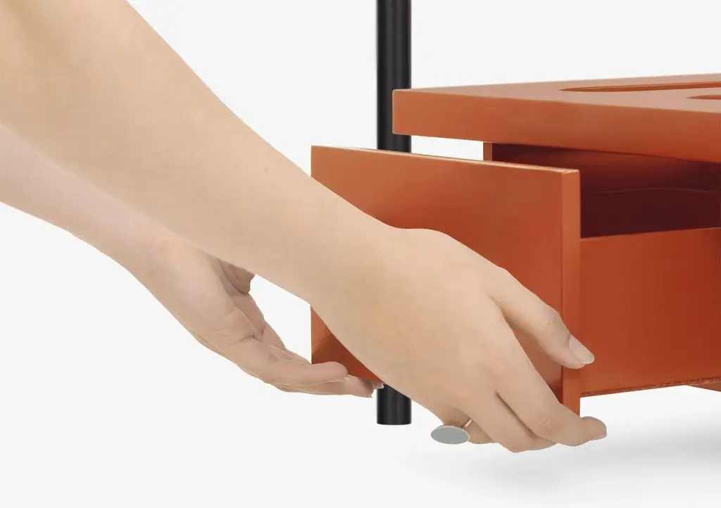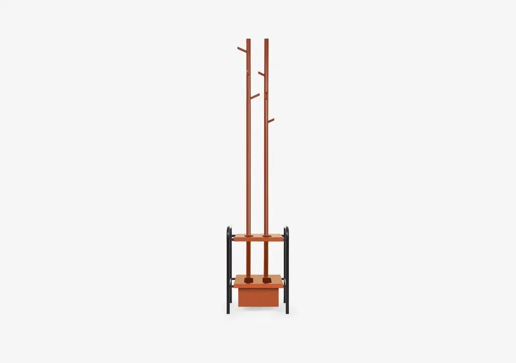 Coat stand composed of 1 lacquered steel structure with fixed feet and 1 top in MDF lacquered. The Living tops have a recess that allows a simple fit into the structure and you can easily change the order of placement This coat stand consist of: Side table/ coat stand structure with feet – Lacquered steel – Black Coat stand – Lacquered – Brick – Includes 2 coat hangers in the same finish of the tops and drawer with 1 water drip vase