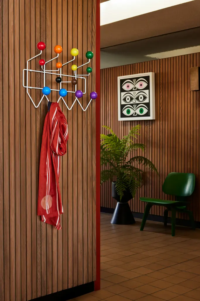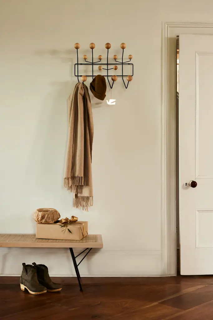 The Eames Hang-It-All, originally released in 1953, exemplifies the Eameses' belief in taking pleasure seriously. Made with a sturdy steel frame and solid wood balls, this colorful coat rack was created using the same technique for simultaneously welding wires that Charles and Ray developed for their low tables and wire chairs. Originally offered with multicolored hooks and a white frame, we've added additional neutral color options to help this fun coat rack find a home in more places.