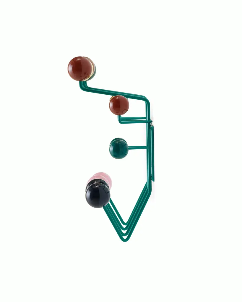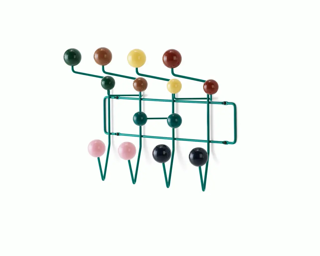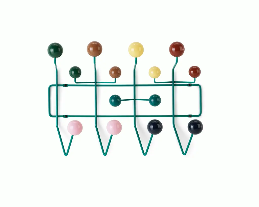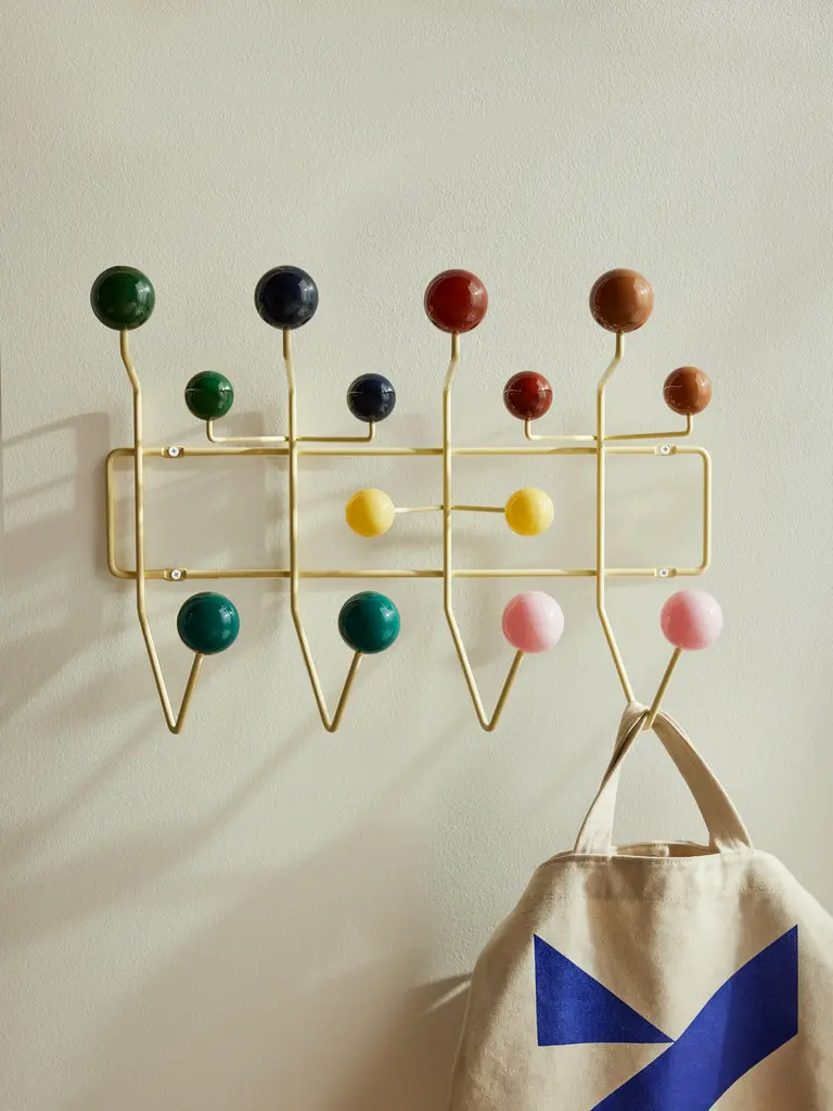 The Eames Hang-It-All, originally released in 1953, exemplifies the Eameses’ belief in taking pleasure seriously. Originally crafted with painted solid-maple wood, this colorful rack is reimagined by Mette and Rolf Hay in cast-glass balls and two spirited new colorways. A clever play on color, tactility, and light, the Herman Miller x HAY collaboration celebrates and enhances Charles and Ray Eames’s whimsical midcentury design. This multipurpose rack—designed to hold coats, hats, bags, and much more—is created using the same technique for simultaneously welding wires that Charles and Ray developed for their low tables and wire chairs.