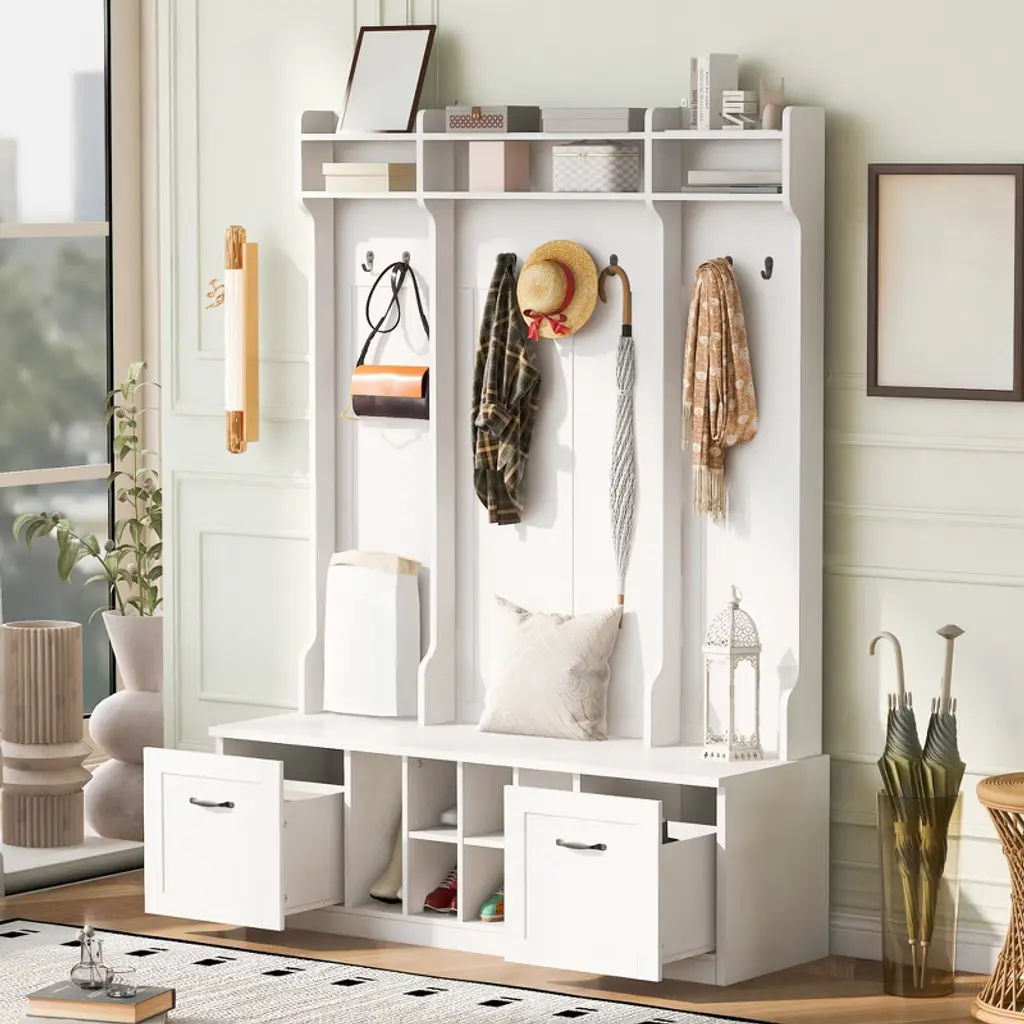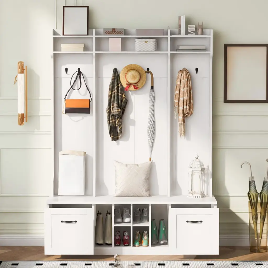 Entryway Hall Tree With Shoe Bench, Entryway Bench With Coat Rack, 58.8'' Wide Coat Rack Storage Shelf For Small Spaces Living Room Hallway White
