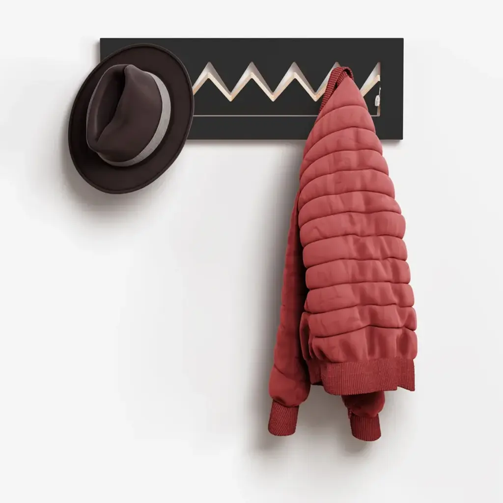 Fläpps Crownhäng is a birch plywood clothes rail. Material: Birch plywood coated with through-dyed HPL, stainless steel Dimensions: closed 60 x 20 x 2 cm + 1 cm wall mount Finish: lacquerThe Crownhäng tops off the Fläpps. Plain and simple, the spikes unfold from the crown and quickly become hooks for the jacket, the scarf or the hat.