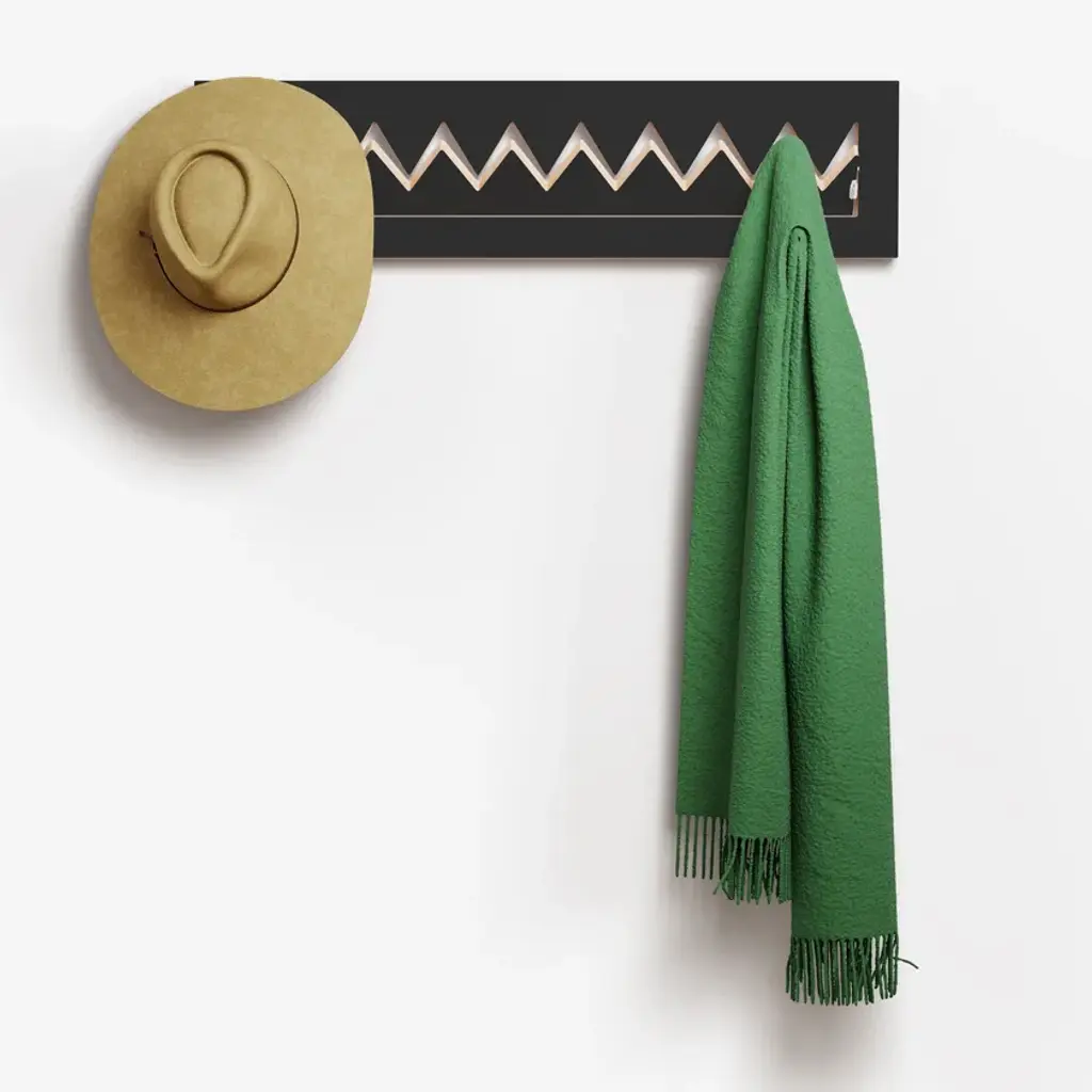 Fläpps Crownhäng is a birch plywood clothes rail. Material: Birch plywood coated with through-dyed HPL, stainless steel Dimensions: closed 80 x 20 x 2 cm + 1 cm wall mount Finish: lacquerThe Crownhäng tops off the Fläpps. Plain and simple, the spikes unfold from the crown and quickly become hooks for the jacket, the scarf or the hat.