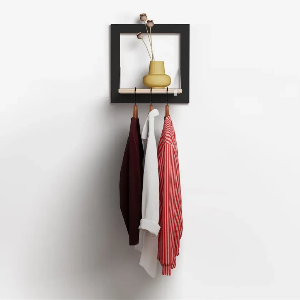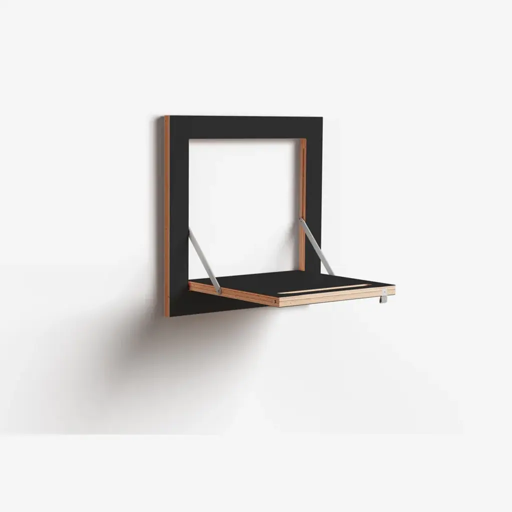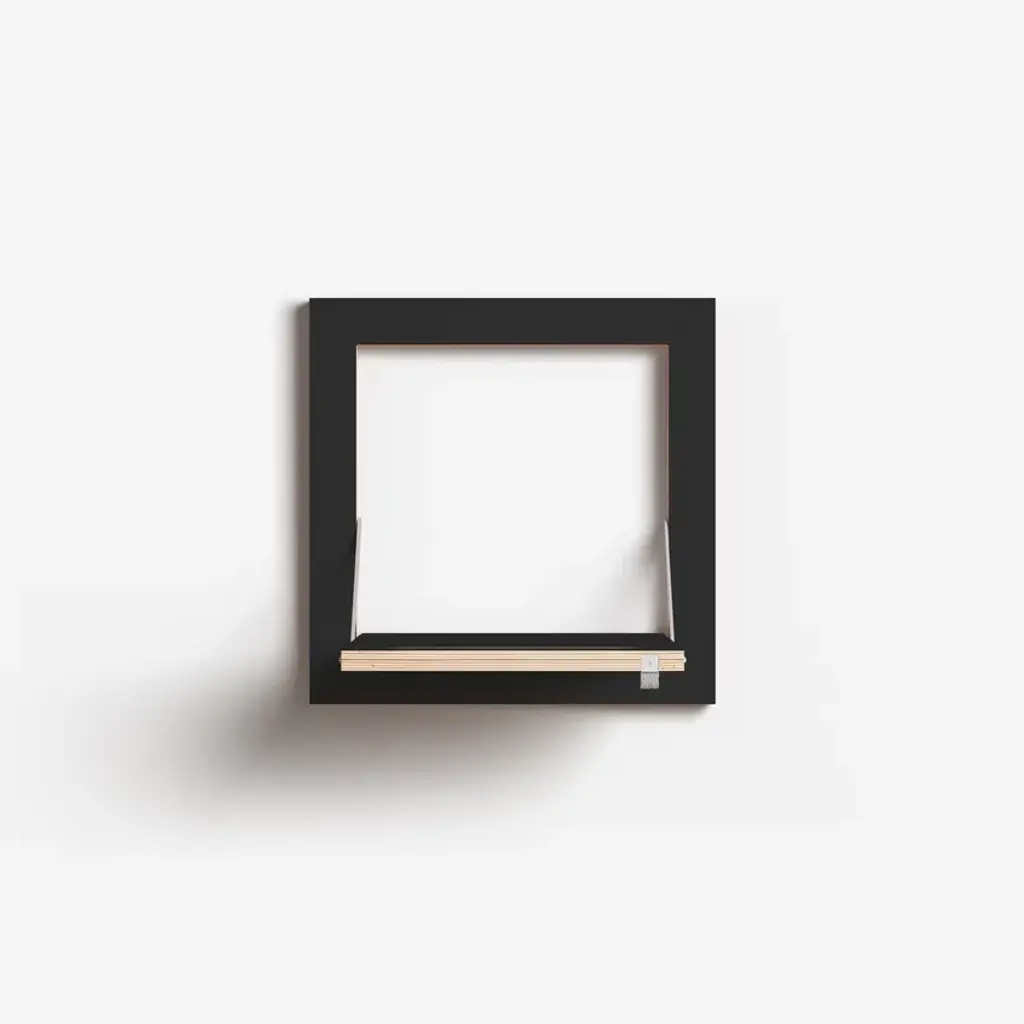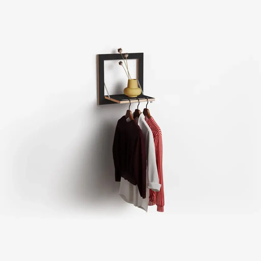 Fläpps Hängrail is a clothes rail. Itis already an old holder. The Hängrail is available in widths of 40, 60 and 80 cm. Although at first glance this would appear to be a standard Fläpps shelf, on closer inspection it doubles as a clever clothes rail. When folded, only one thin slot draws the attention to the hidden function.Material: Birch plywood coated with through-dyed HPL, stainless steel Dimensions: closed: 40 x 40 x 2 cm + 1 cm wall mount The whole Fläpps Collection is printable and combinable with each other. That gives anyone the freedom to individually compose their wall-setup, and change it whenever they are undecided. A wall mounting mechanism, especially designed for this purpose, makes it possible. It consists of two wooden slats that can effortlessly be connected to the wall by using the provided stencil. After that Fläpps can be mounted safely and stable. In this way no abrasion occurs to the product while mounting and demounting so nothing stands in the way for undecided people. No matter how often they like to move or reposition their product.