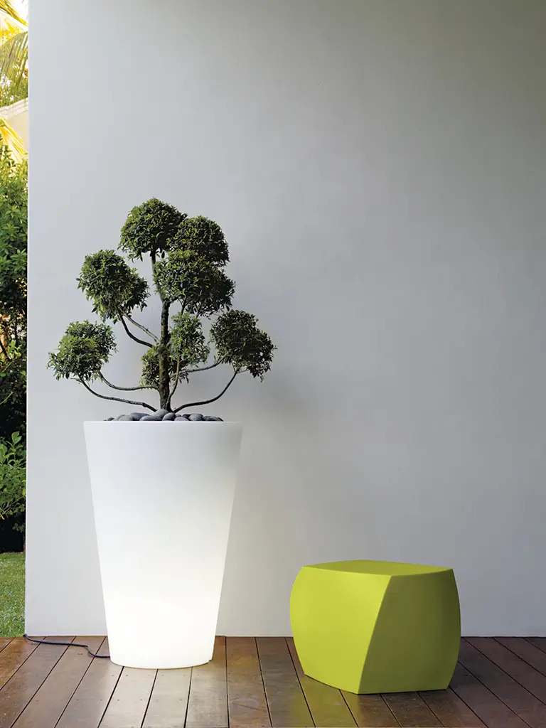 The sense of play evident in Frank Gehry's architecture also informs the Gehry Left Twist Cube (2004) from Heller. As unique and beautiful as his buildings, this sculptural monolithic piece comes in vibrant colors inspired by Gehry's flower sculpture for French artist Sophie Calle. Each hollow single-piece form features consistent wall thickness and stress-free outer corners for supreme resistance to breakage. Suitable for residential and commercial use indoors and out. Made in U.S.A.