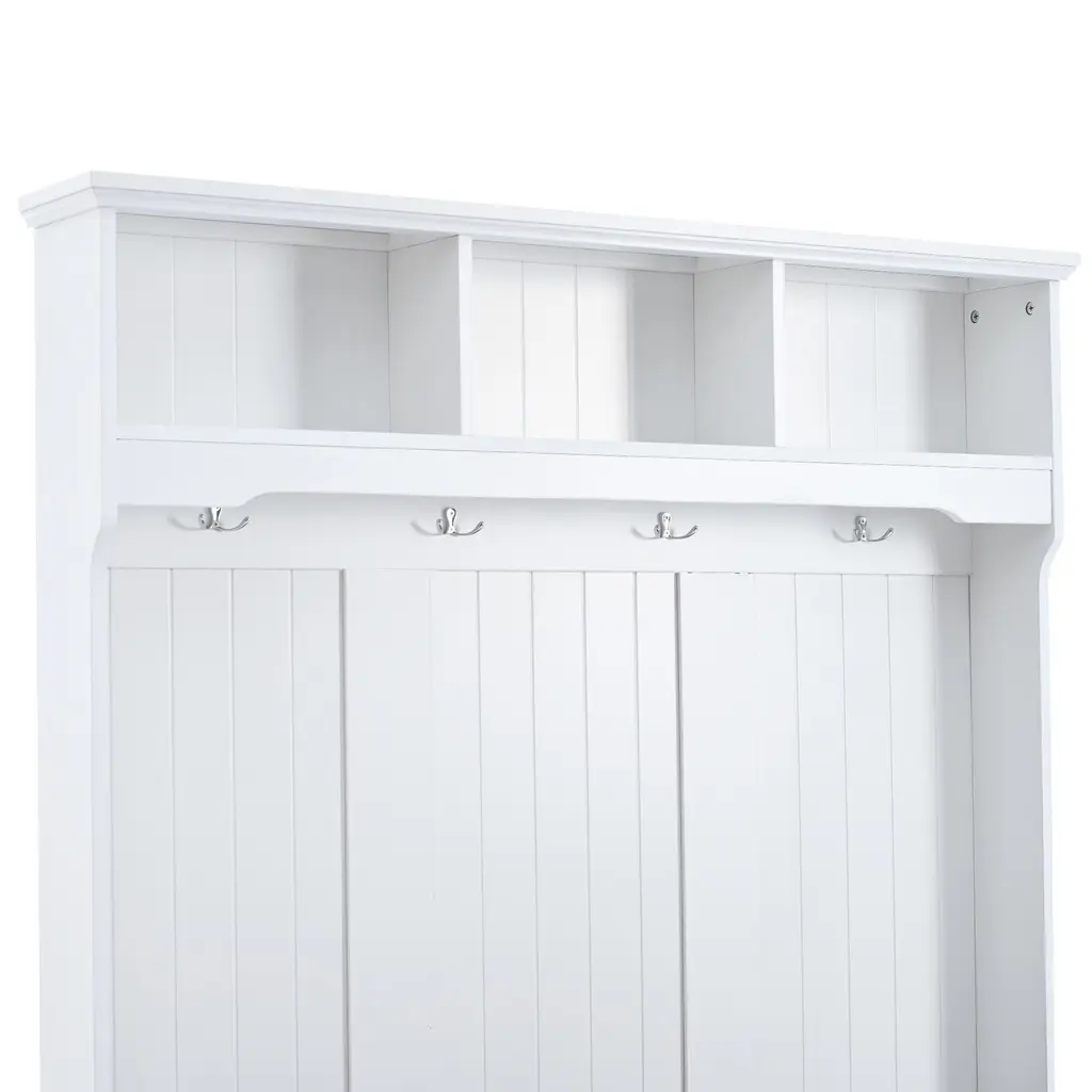 Hall Tree Entryway Bench With Coat Rack And Shutter-Shaped Doors Large Storage Shelves - White