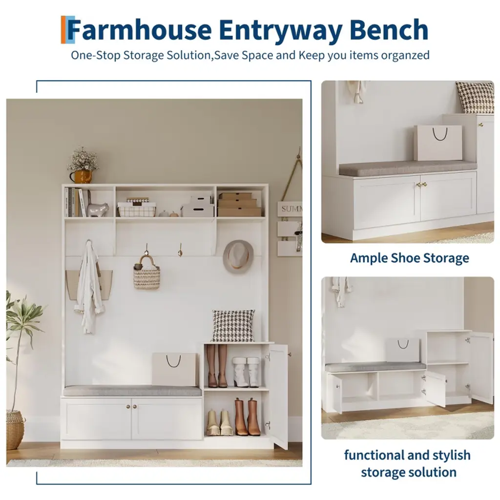 Hall Tree With Bench And Shoe Storage, 3-in-1 Farmhouse Entryway Bench With Coat Rack, 4 Hooks, 4 Shoe Cubbies & 3 Open Compartments