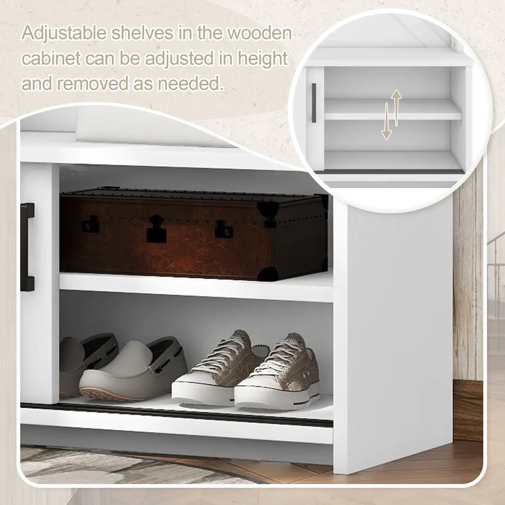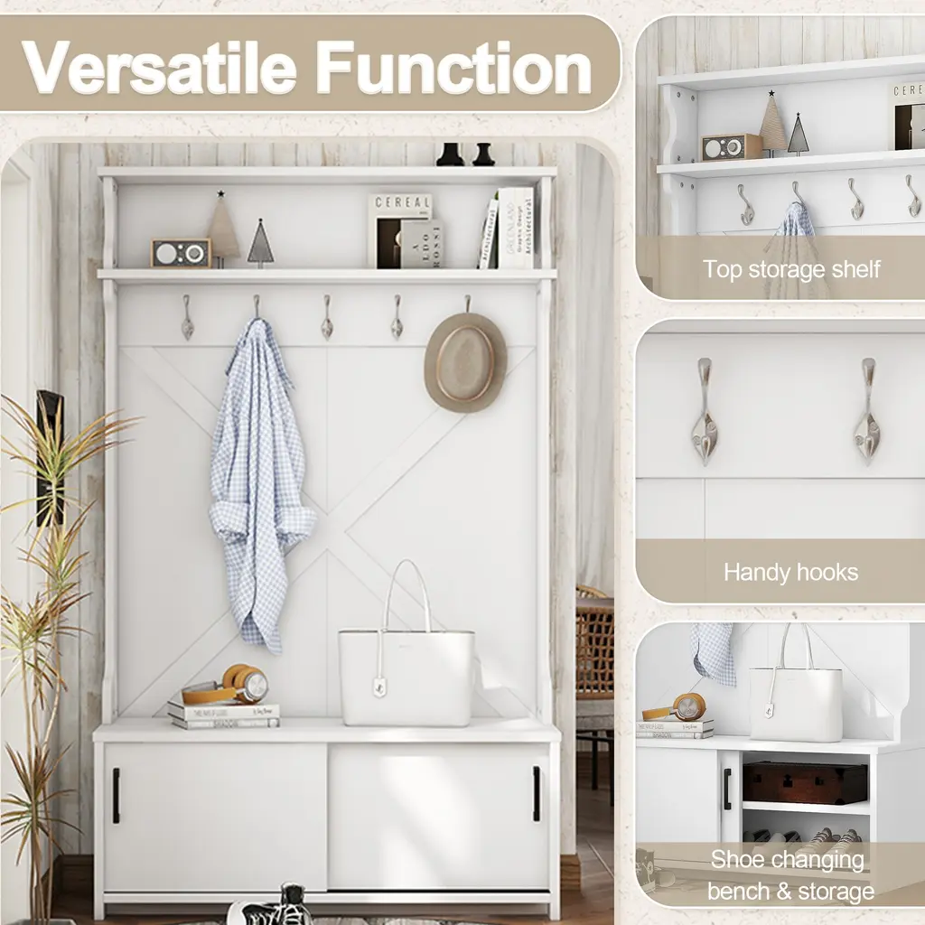 Hall Tree With Top Shelf And Storage Bench,hallway Shoe Cabinet With Sliding Doors,coat Rack With 5 Hanging Hooks - White