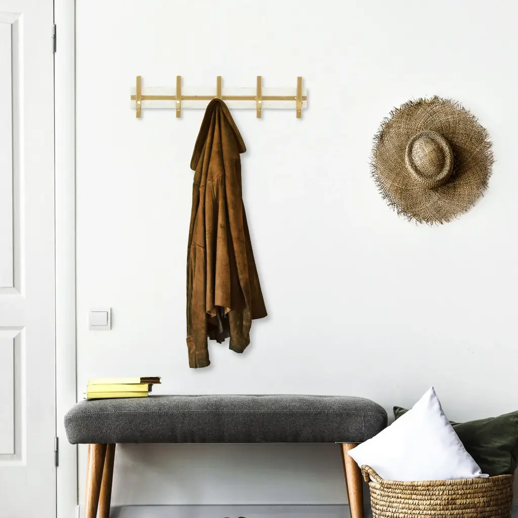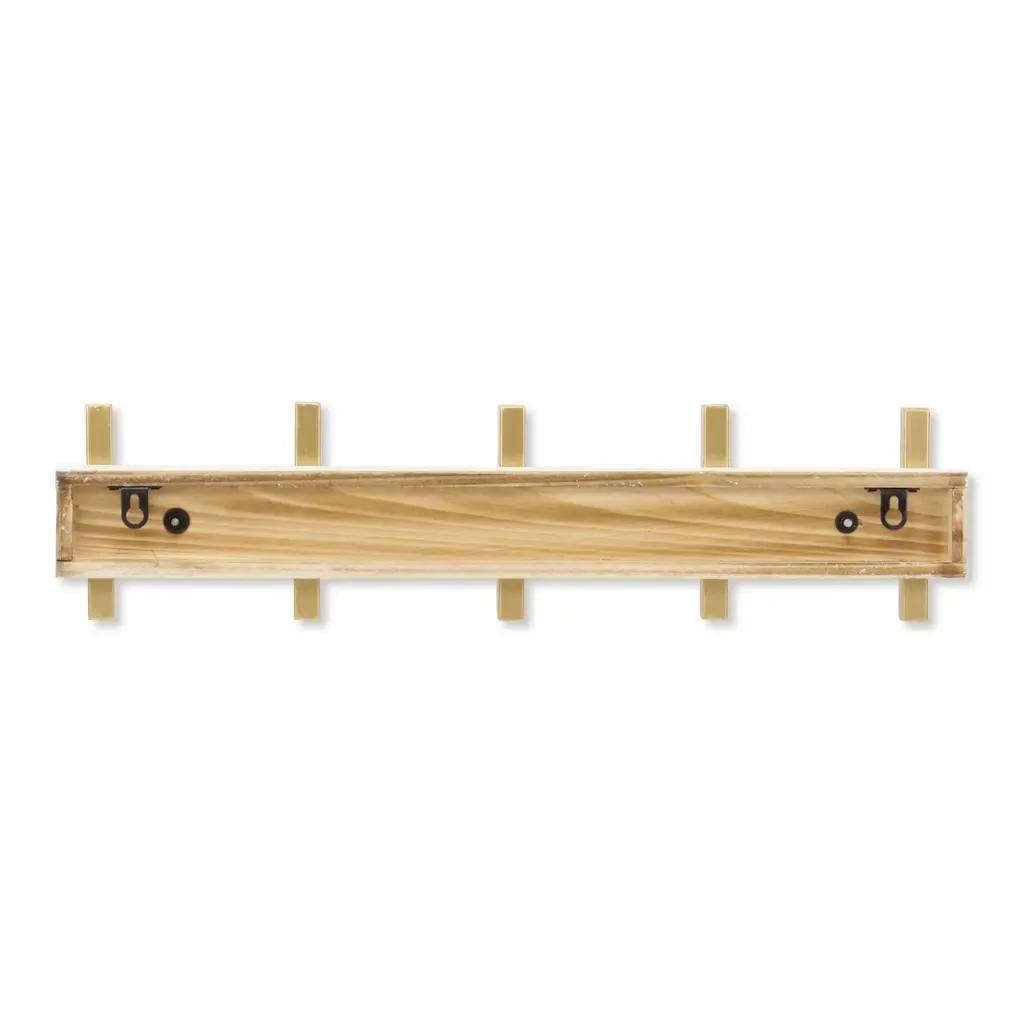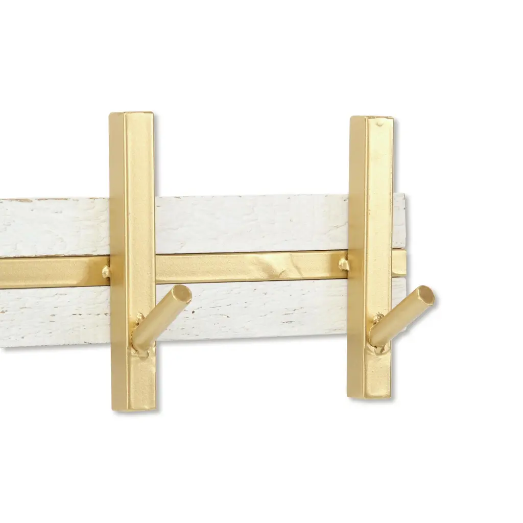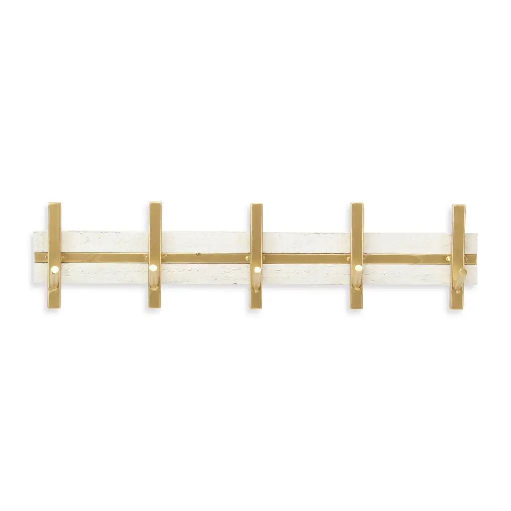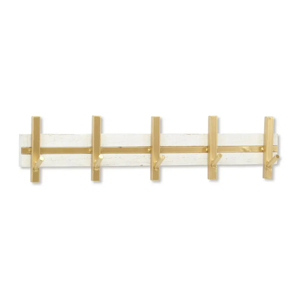Elevate your entryway with the 5-hook modern coat rack, a chic blend of style and function. Handcrafted with white wood and sleek gold metal, this minimalist design features five gold hooks for organizing your coats, bags, and more. Perfect stylish solution to keep your space tidy while adding a touch of modern elegance. Enhance any interior with its contemporary charm. Product Features: White and gold coat rack Showcases a rustic finish Handcrafted Includes 5 metal hooks Includes 2 openings on the rear for easy hanging No assembly required Recommended for indoor use only Care instructions: Spot clean only Dimensions: 5.25"H x 21.75"W x 3.25"D Material(s): wood/metal