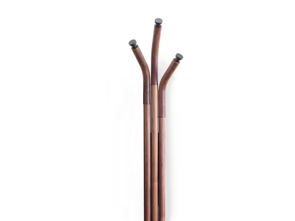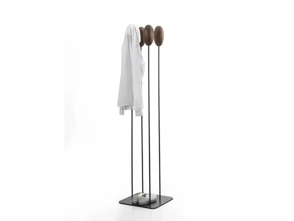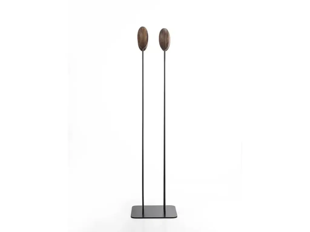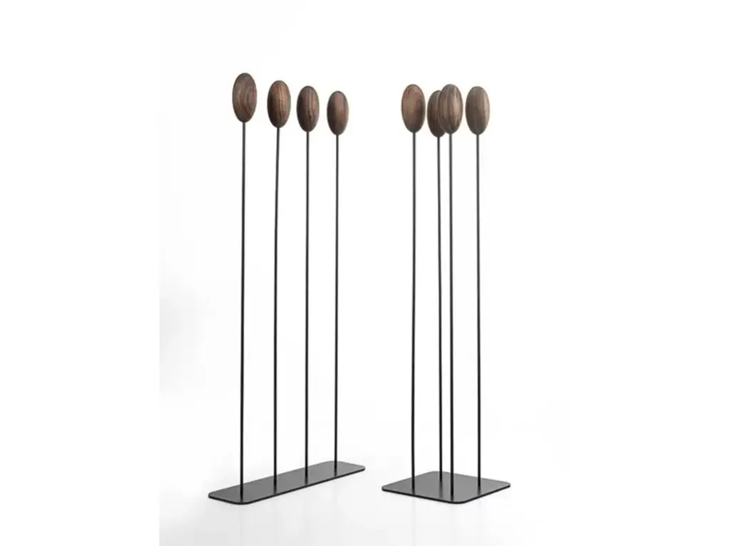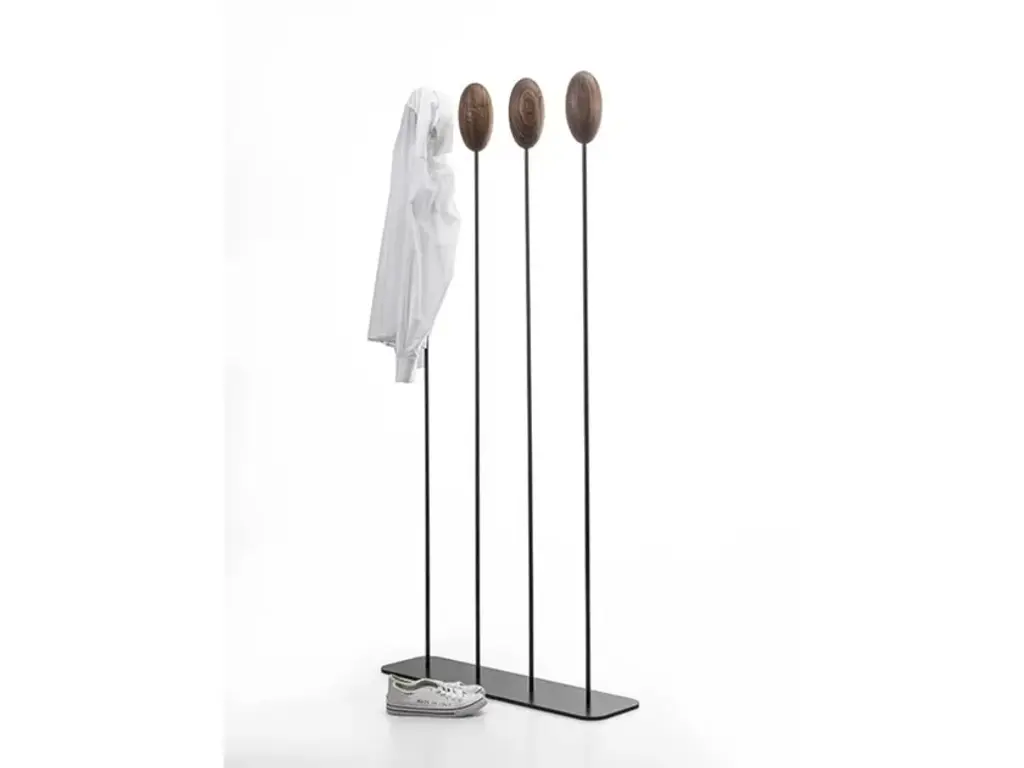 Harry is a coat hanger with an iron base and flexibile vertical central supports, topped by an egg made entirely in solid wood with glued slats, replacing the classic hooks. Available in two versions: with square or round base.