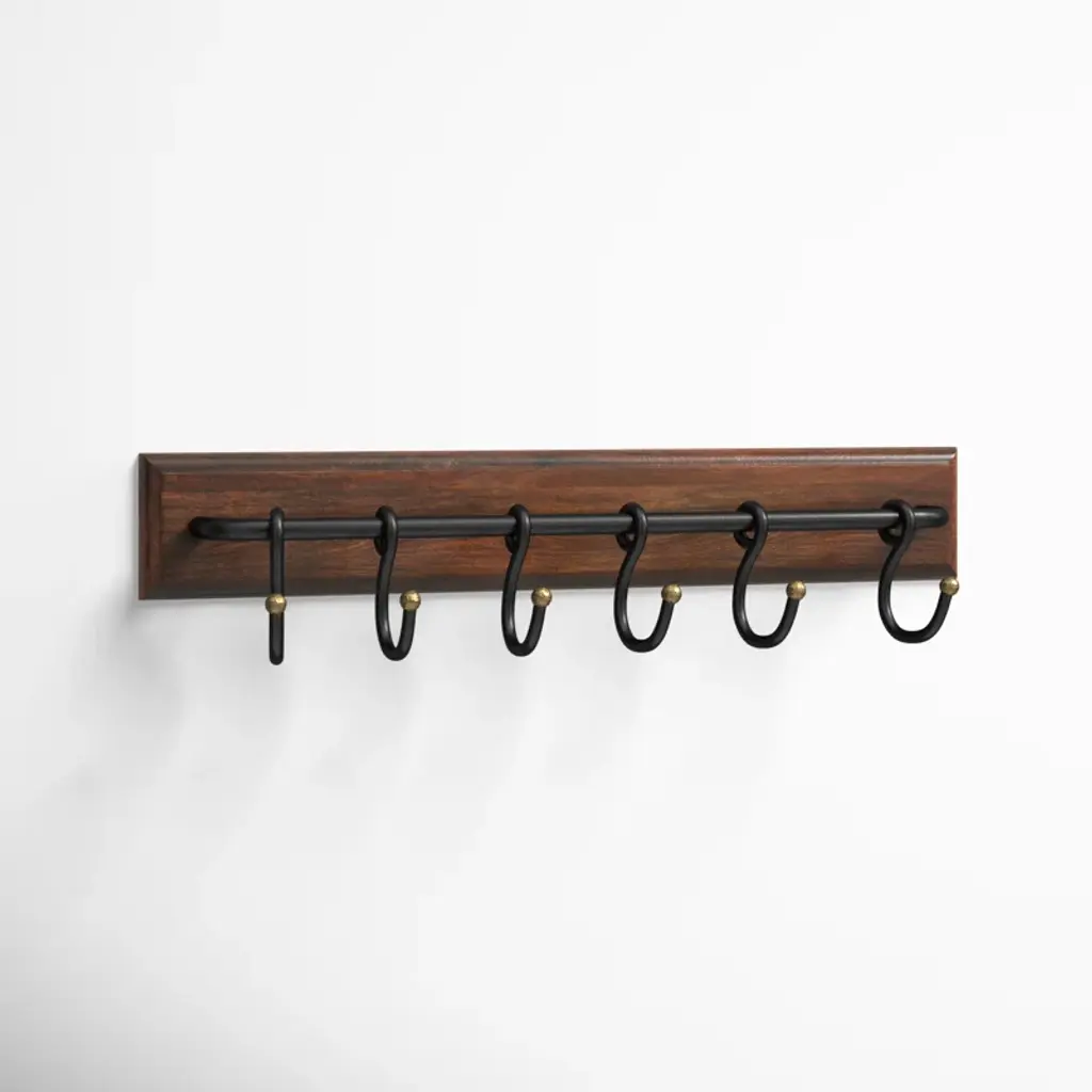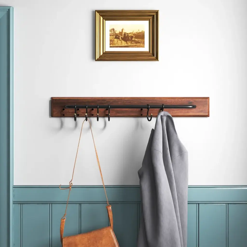 Keep your family's coats and bags organized in your entryway with this wall-mounted coat rack. It's crafted with solid mango wood in a neutral dark brown finish, and has a rectangular silhouette that mounts to your wall to save square footage. This rack also has a rustic iron bar that comes with six movable metal hooks so you can hang up jackets, bags, scarves, and other on-the-go essentials. Since they're mobile, you can always move some aside to make room for umbrellas or other items.