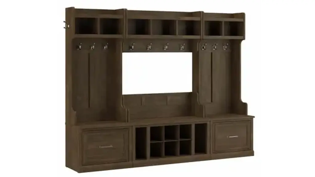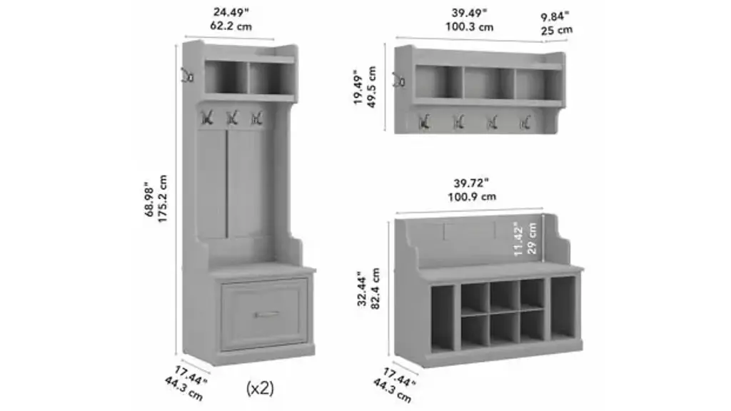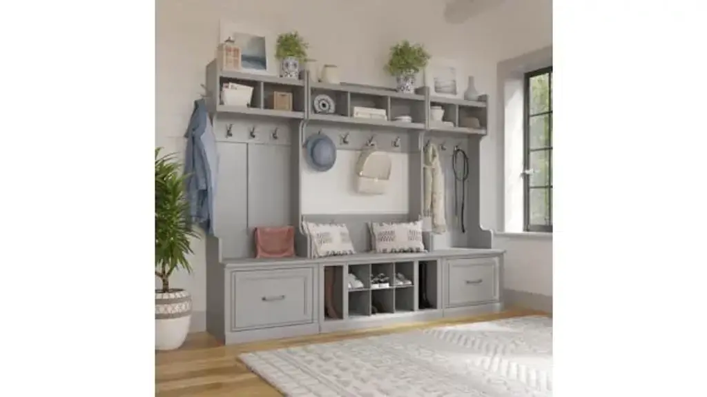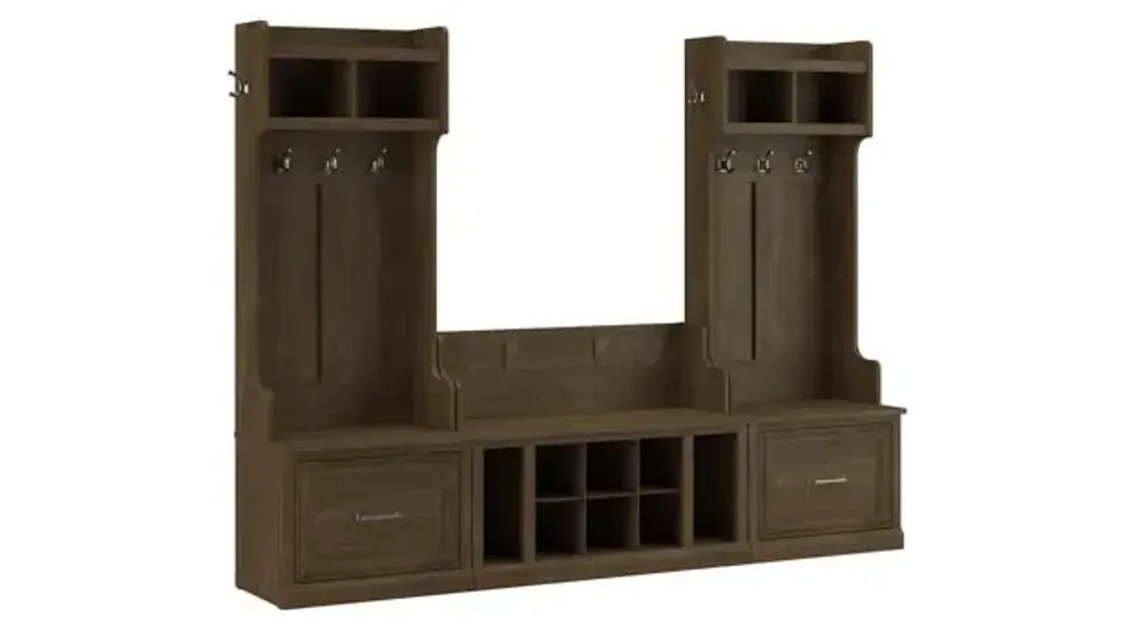 The Bush Furniture Woodland Full Entryway Storage Set with Coat Rack and Shoe Bench with Drawers combines transitional styling and a practical design to offer an ideal organization solution. Have a seat on the durable storage bench and take a moment to relax as you get ready to head out the door or come home after a long day. Each section of the long mudroom bench supports up to 250 lbs., so you can sit down to put on and take off your shoes or set shopping bags down after a trip to the store with confidence. Vertical and cube shelving along with two small drawers to the left and right accommodate footwear and accessories for a clutter-free entryway, mudroom or foyer. The narrow hall trees and wall mounted shelf include a total of 10 Weathered Nickel coat hooks in the front and one on each side for hanging jackets, hats, scarves and more. Smaller items like gloves and keys can be stashed neatly inside seven open compartments, and the top shelves provide an area to brighten up your entryway with decorations. The hall tree bench's transitional design blends elements of contemporary and traditional styling to complement a wide range of home furnishings while your choice of finish options make it easy to find the perfect look for your space. This entryway bench and coat rack set has been tested to meet Bush Furniture's standards for safety, performance and durability. Overall Dimensions: 89"W x 17.44"D x 68.98"H. Hall Tree with Small Shoe Bench (set of 2): 24.49"W x 17.44"D x 68.98"H. Shoe Storage Bench with Shelves and Seat Back: 39.72"W x 17.44"D x 32.44"H. Wall Mounted Coat Rack with Shelf: 39.49"W x 9.84"Dx 19.49"H. Ships ready for easy assembly.