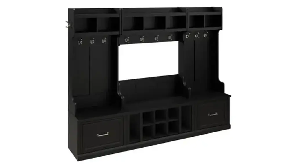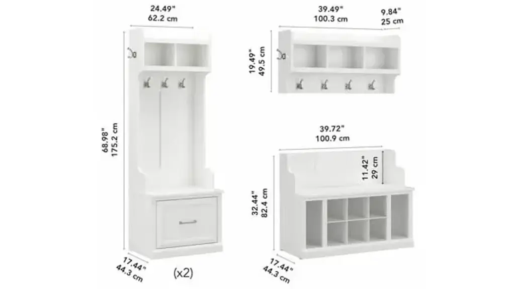 The Bush Furniture Woodland Full Entryway Storage Set with Coat Rack and Shoe Bench with Drawers combines transitional styling and a practical design to offer an ideal organization solution. Have a seat on the durable storage bench and take a moment to relax as you get ready to head out the door or come home after a long day. Each section of the long mudroom bench supports up to 250 lbs., so you can sit down to put on and take off your shoes or set shopping bags down after a trip to the store with confidence. Vertical and cube shelving along with two small drawers to the left and right accommodate footwear and accessories for a clutter-free entryway, mudroom or foyer. The narrow hall trees and wall mounted shelf include a total of 10 Weathered Nickel coat hooks in the front and one on each side for hanging jackets, hats, scarves and more. Smaller items like gloves and keys can be stashed neatly inside seven open compartments, and the top shelves provide an area to brighten up your entryway with decorations. The hall tree bench's transitional design blends elements of contemporary and traditional styling to complement a wide range of home furnishings while your choice of finish options make it easy to find the perfect look for your space. This entryway bench and coat rack set has been tested to meet Bush Furniture's standards for safety, performance and durability. Overall Dimensions: 89"W x 17.44"D x 68.98"H. Hall Tree with Small Shoe Bench (set of 2): 24.49"W x 17.44"D x 68.98"H. Shoe Storage Bench with Shelves and Seat Back: 39.72"W x 17.44"D x 32.44"H. Wall Mounted Coat Rack with Shelf: 39.49"W x 9.84"Dx 19.49"H. Ships ready for easy assembly.