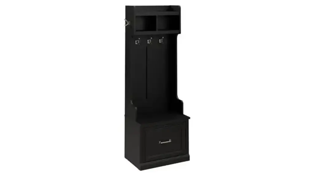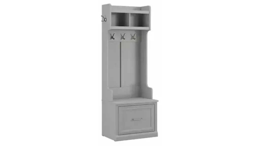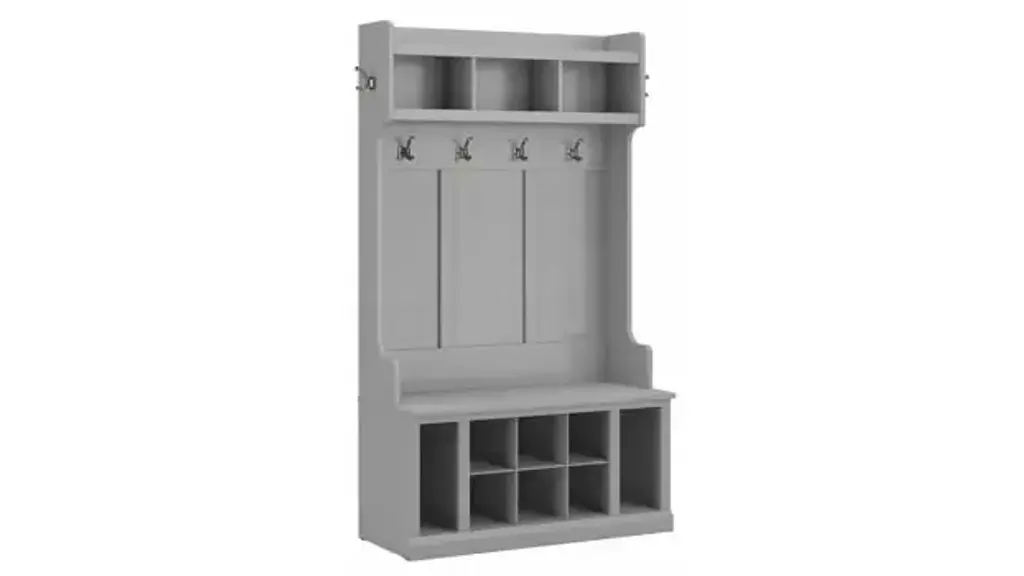 The Bush Furniture Woodland 24" W Hall Tree and Small Shoe Bench with Shelves combines transitional styling and a practical design to offer an ideal entryway organizer. Have a seat on the durable bench surface and take a moment to relax as you get ready to head out the door or come home after a long day. The top of the mudroom bench supports up to 250 lbs, so you can sit down to put on and take off your shoes or set shopping bags down after a trip to the store with confidence. Six built-in cubby spaces keep your home's entrance organized while providing easy access to footwear and accessories. The narrow Hall Tree features three Weathered Nickel coat hooks in the front and one on each side for hanging jackets, hats, scarves and more. Smaller items like gloves and keys can be stashed neatly inside two open compartments, and the top shelf provides an area to brighten up your entryway with decorations. The storage bench's transitional design blends elements of contemporary and traditional styling to complement a wide range of home furnishings while your choice of several attractive finish options make it easy to find the perfect look for your space. This entryway bench with storage has been rigorously tested to meet Bush Furniture's standards for safety, performance and durability. See the full Woodland Collection to complete your home's entryway, mudroom or foyer with style. Overall Dimensions: 24.5" W x 17.5" D x 69.38" H. Ships ready for easy assembly.